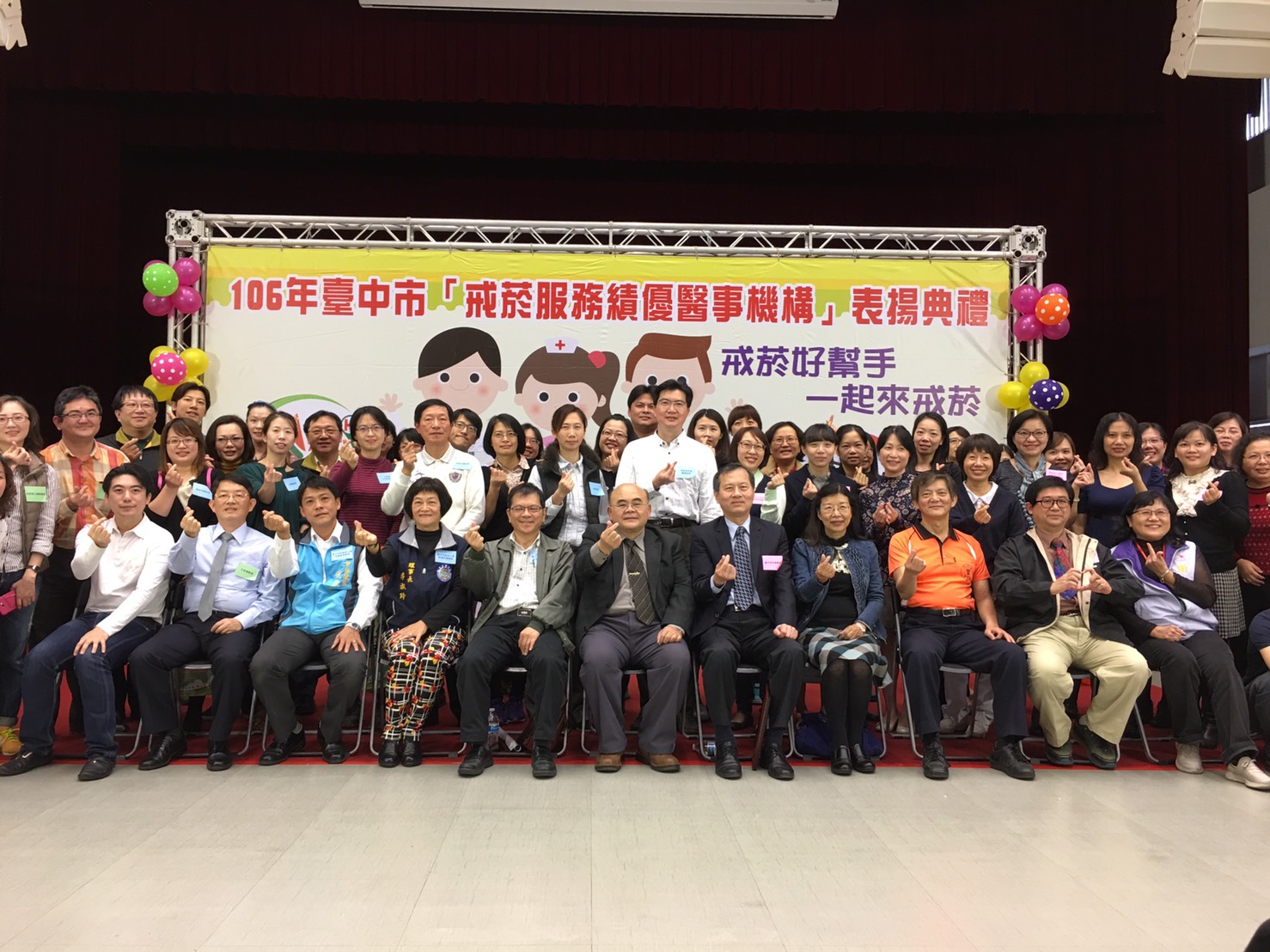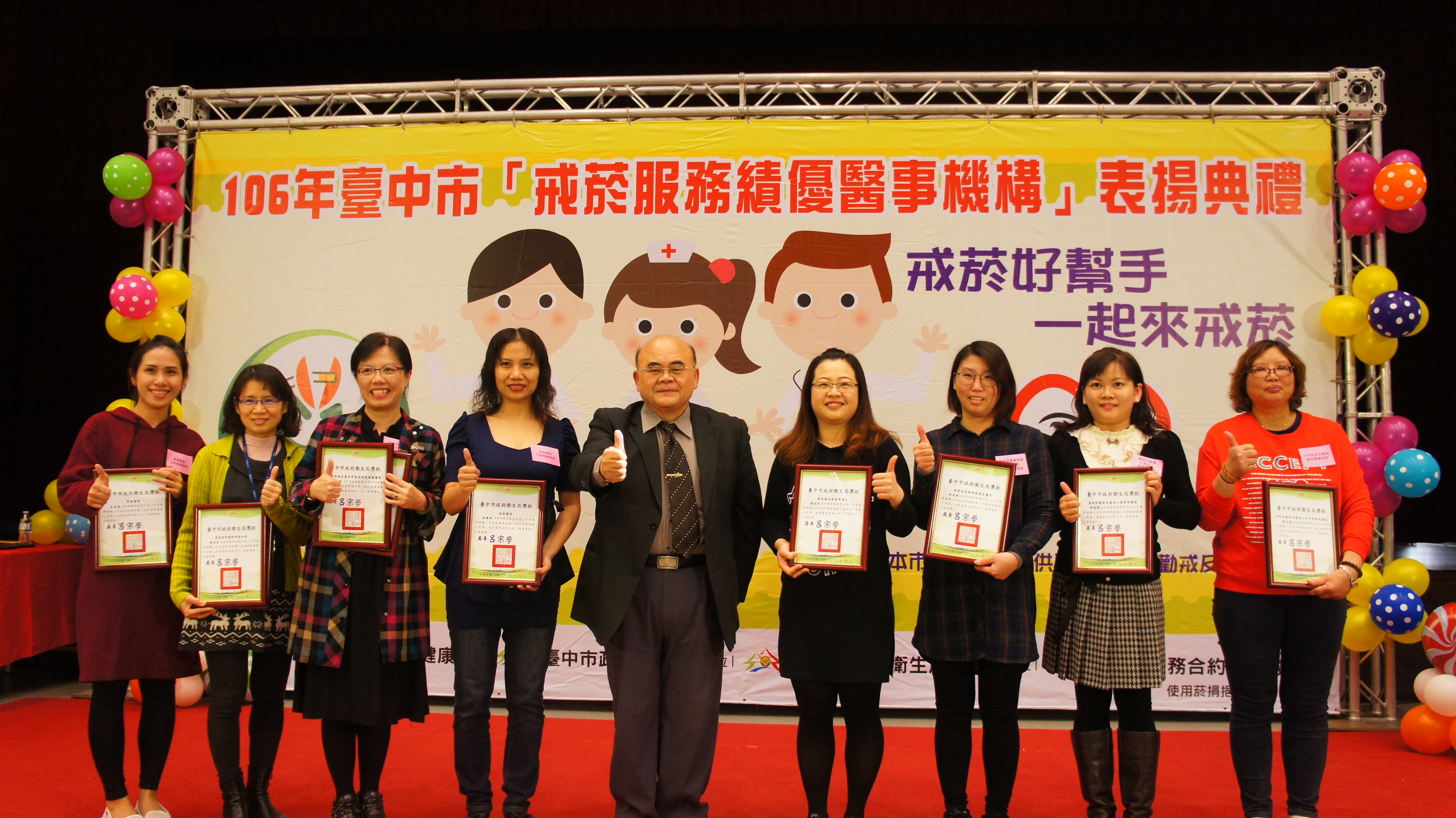 台中市政府衛生局今(26)日舉行「106年台中市戒菸服務績優醫事機構表揚典禮」,由衛生局副局長張瑞麟頒獎給9家戒菸服務績優醫院、20家診所、20家藥局、15家衛生所及29名績優醫事人員,表揚他們在推動戒菸服務及幫助吸菸者戒菸的成果。