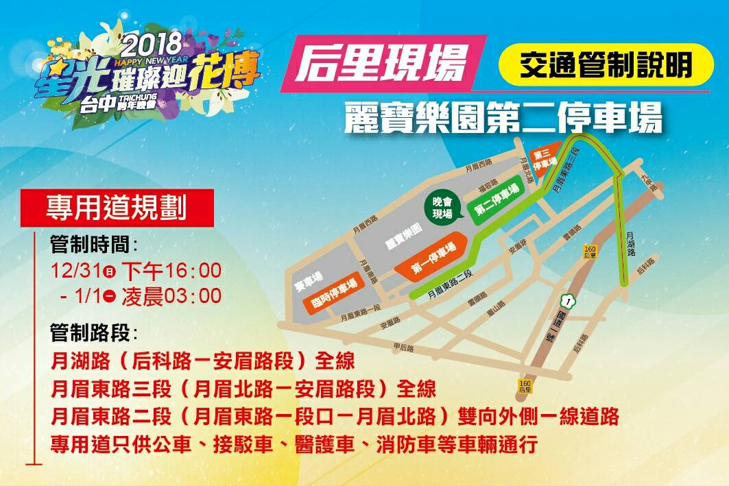 「后里現場」麗寶樂園第二停車場部分,新聞局表示,這次后里現場的卡司相當堅強,市府同樣安排豐富且完整的交通接駁規劃,提供5個接駁站點,這是全台所有跨年場次中,單一場次最多接駁站的晚會,準備近400輛接駁車,接駁與疏散民眾,盼讓大家開心共同迎接2018到來。