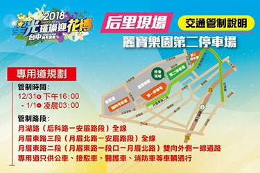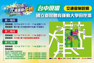 活動期間場地周邊將進行交通管制,為避免交通壅塞,市府在后里現場規劃5條接駁專車路線,共有超過300台接駁車將分別從豐原火車站、后里國小、中科友達停車場、秋紅谷(市政北七路口)及台鐵新烏日站往返麗寶樂園第二停車場。此外,台鐵也配合增開班次,市區公車業者則配合進行部分路線改道及延後收班,鼓勵民眾踴躍搭乘大眾運輸工具。詳細交通管制與接駁資訊,請參考活動相關報導(http://bit.ly/2DpOfLf)。