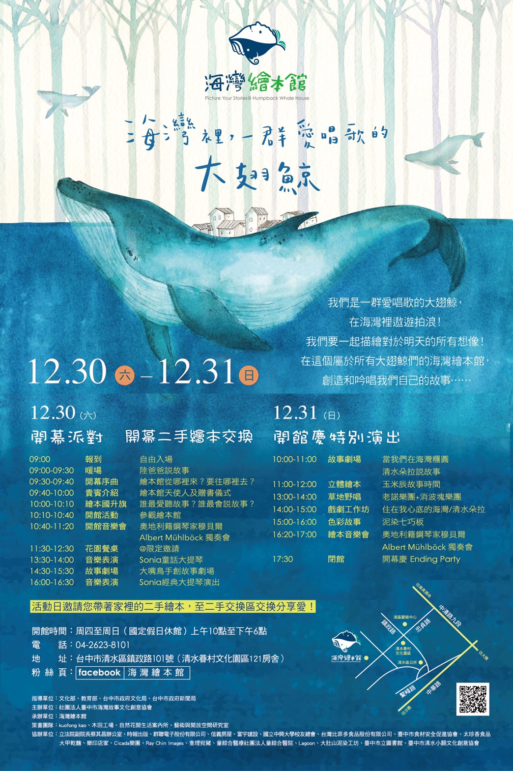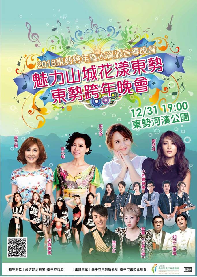 今年東勢區公所及東勢區農會也將於31日在東勢河濱公園舉辦《魅力山城花漾東勢 東勢跨年晚會》,除有在地藝文團體暖場表演外,更邀請到梁文音、曾心梅、梁又南、劉明湘、張中立、知己二重唱、藍薰(小黃小琥)、小老鷹樂團以及天爵樂團等多位重量級藝人,歡迎共襄盛舉!本週還有不少展覽、演講等活動,更多資訊,請見「中市週末活動看板1230_0101」。(12/29*6)*新聞局