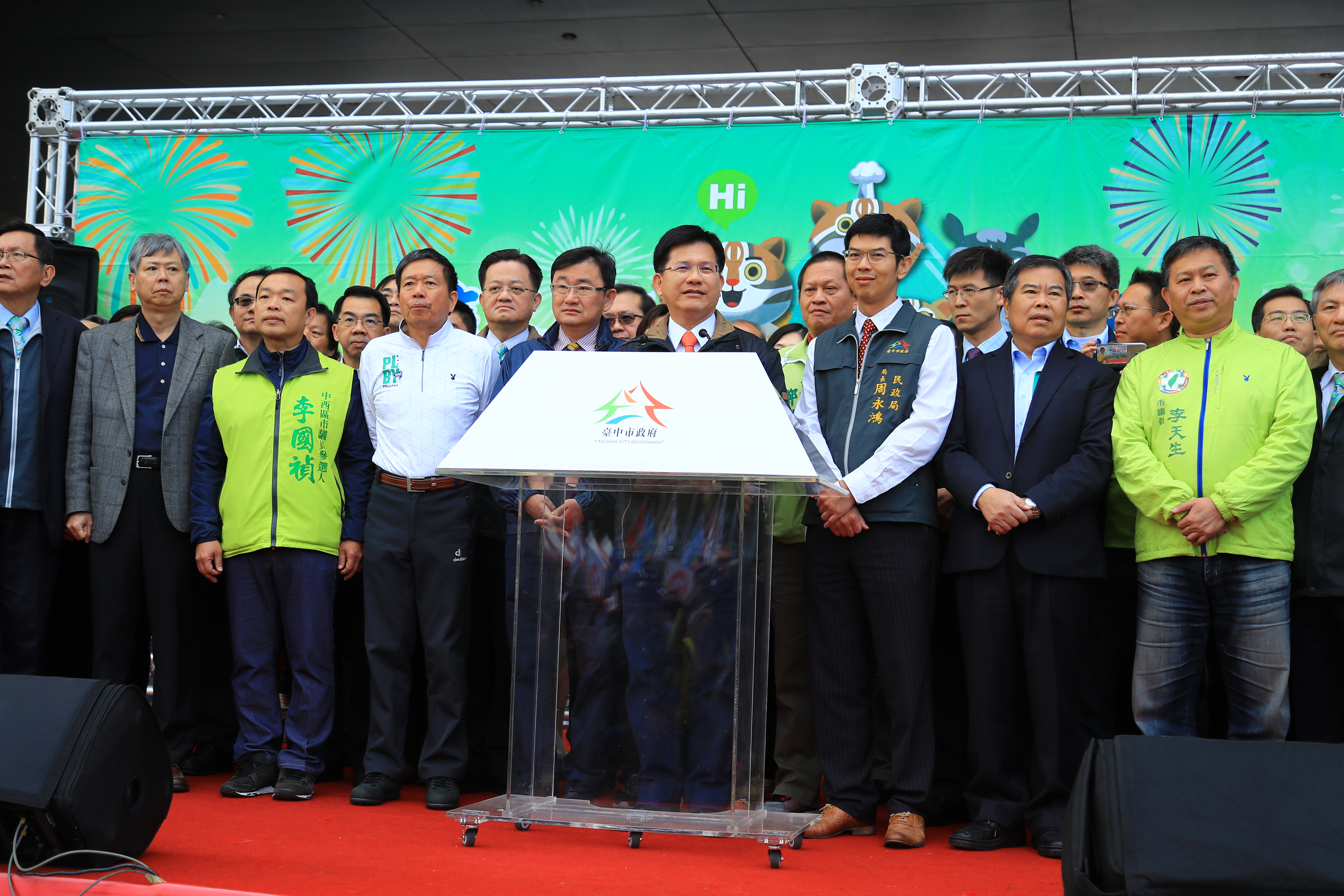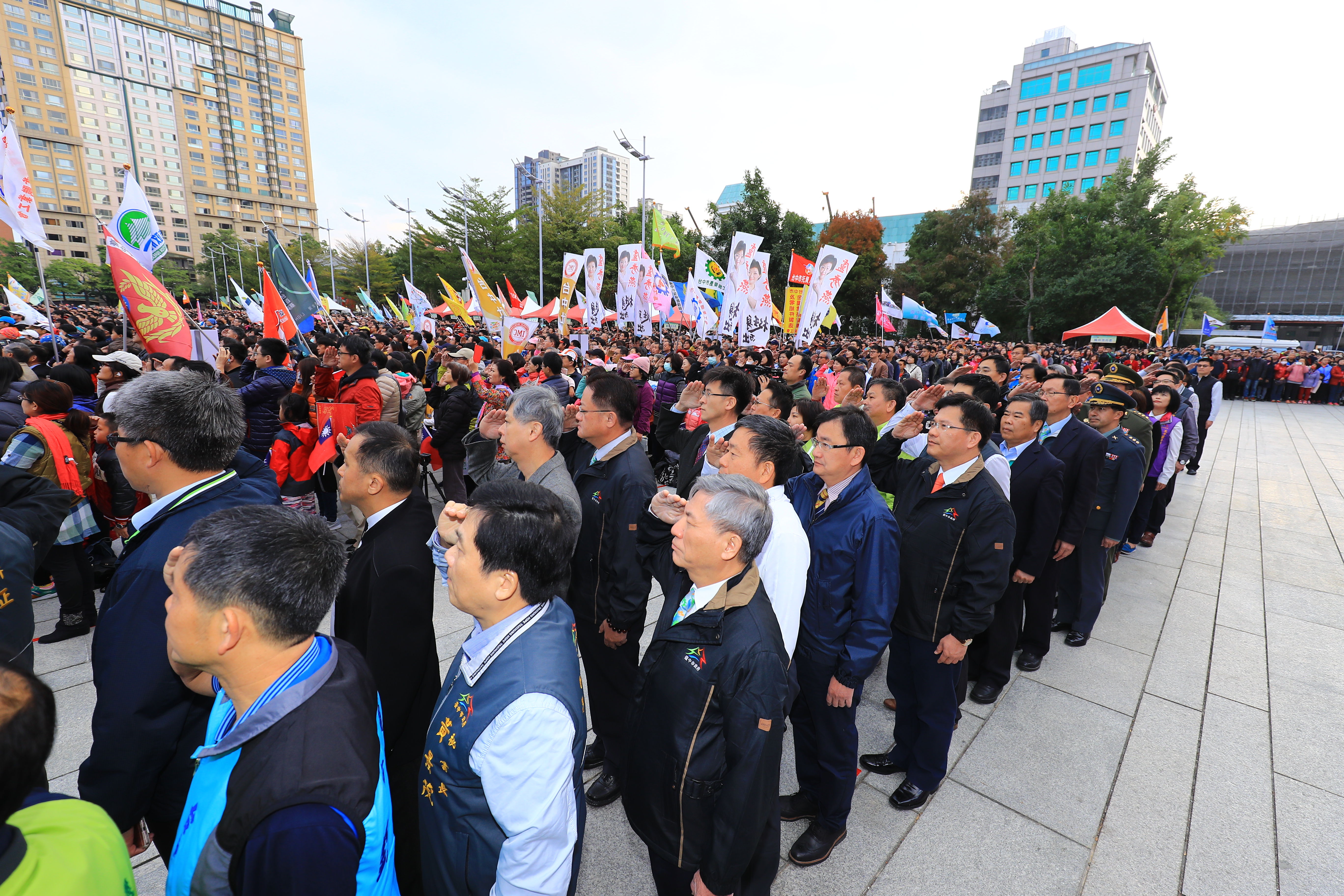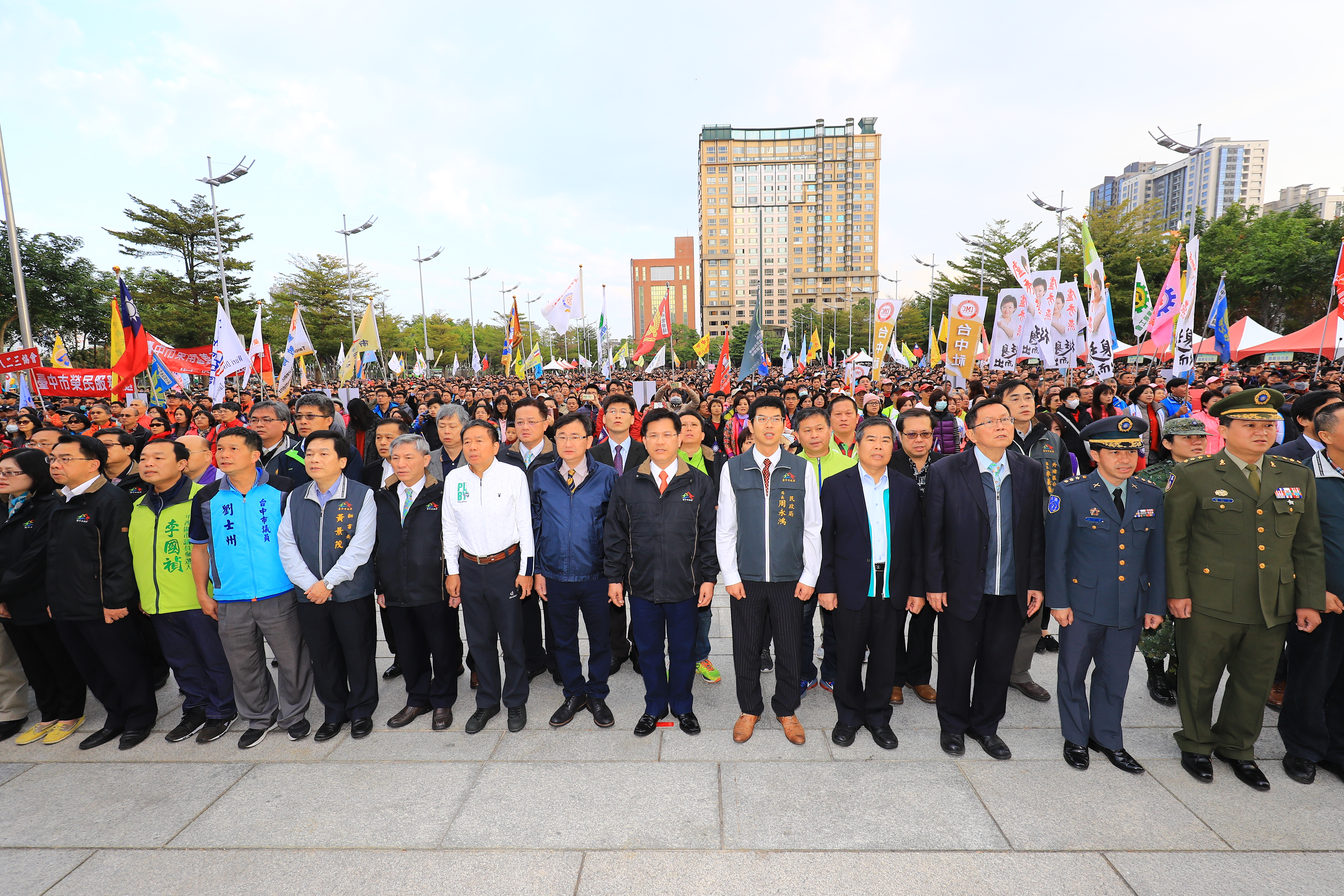 今日市府元旦升旗典禮,特別邀請10位來自來日本、加拿大、越南、泰國、印尼、中國大陸等新住民親子及魯凱族和阿美族原住民領唱國歌,林市長也率領市府團隊參加;隨後由林市長啟動花博年儀式,象徵台中因花博走向世界,而世界也與台中接軌。包括立法委員黃國書、盧秀燕、市議員何文海、何敏誠、李天生、劉士州及張廖乃綸等人也出席,一起迎接充滿活力及希望的一年之始。