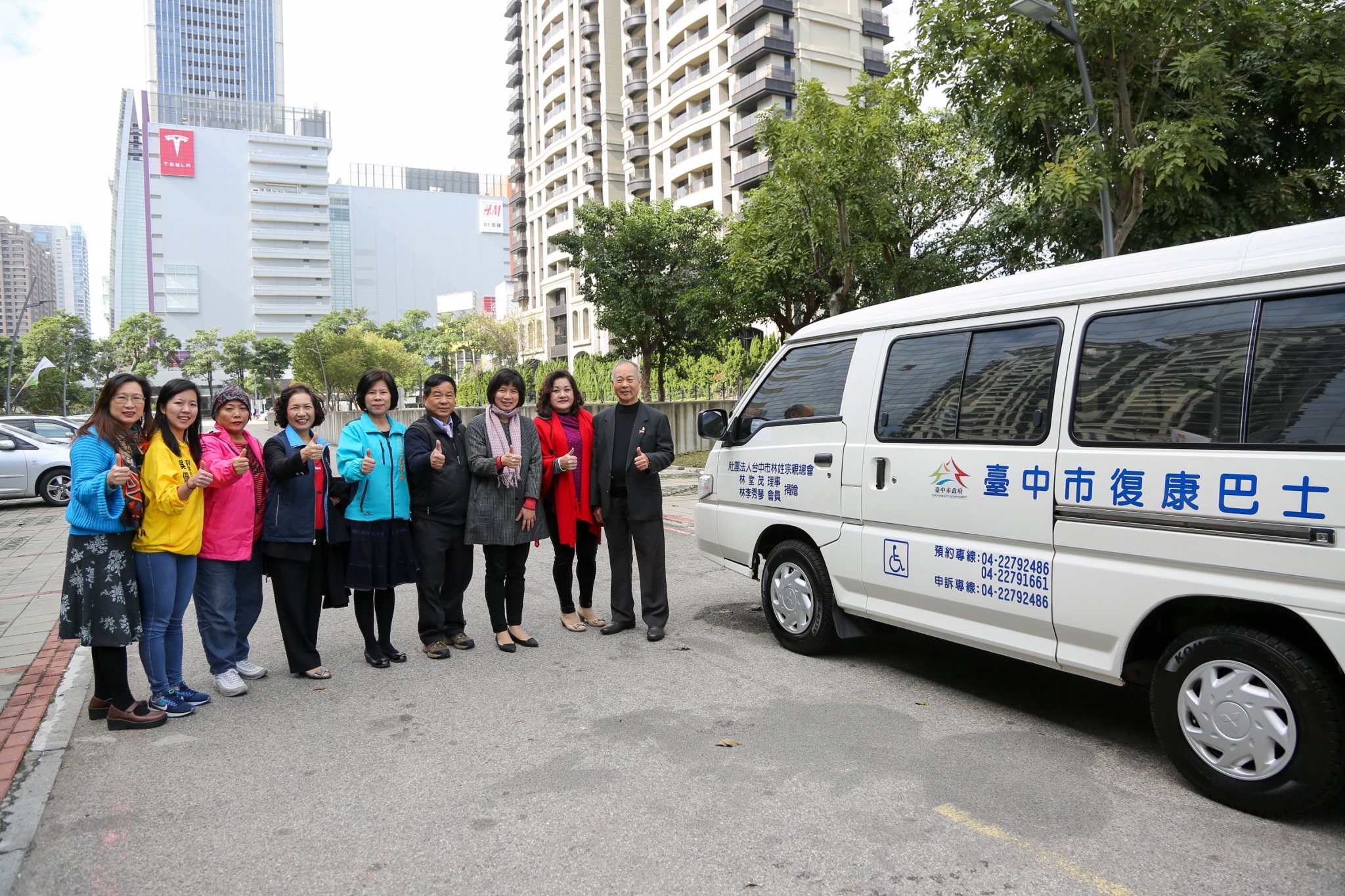 林副市長表示,全市目前身障人口已達12萬人,就醫、就學等交通接送需求龐大,加上部分復康巴士也需要汰舊換新,感謝林堂茂賢伉儷捐贈復康巴士給台中市政府社會局,帶給身障朋友一個非常大的新年禮物。