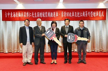 捐贈儀式今(11)日於台灣大道市政大樓舉行,林副市長在環保局長白智榮的陪同下出席,她頒贈慈光獎章感謝梁博仁積極參與社會公益,捐贈車輛、機具、裝備等支援台中市的環境清潔工作,增強環保能量。市議員何明杰也到場見證。