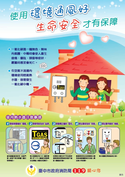 消防局呼籲,民眾可自行檢視家中熱水器安裝位置是否安全,家中安裝熱水器應確實遵守「五要」原則,才能免於一氧化碳中毒危險:要保持環境的「通風」、要選擇合格的「標示」、要使用正確的「型式」、要注意安全的「安裝」及要注意平時的「檢修」;另若對家中熱水器安全有疑慮時,可直接撥打「119」利用消防局「反碳風水師」服務,消防人員將前往民眾家中檢查熱水器是否安全。(1/18*18)*消防局