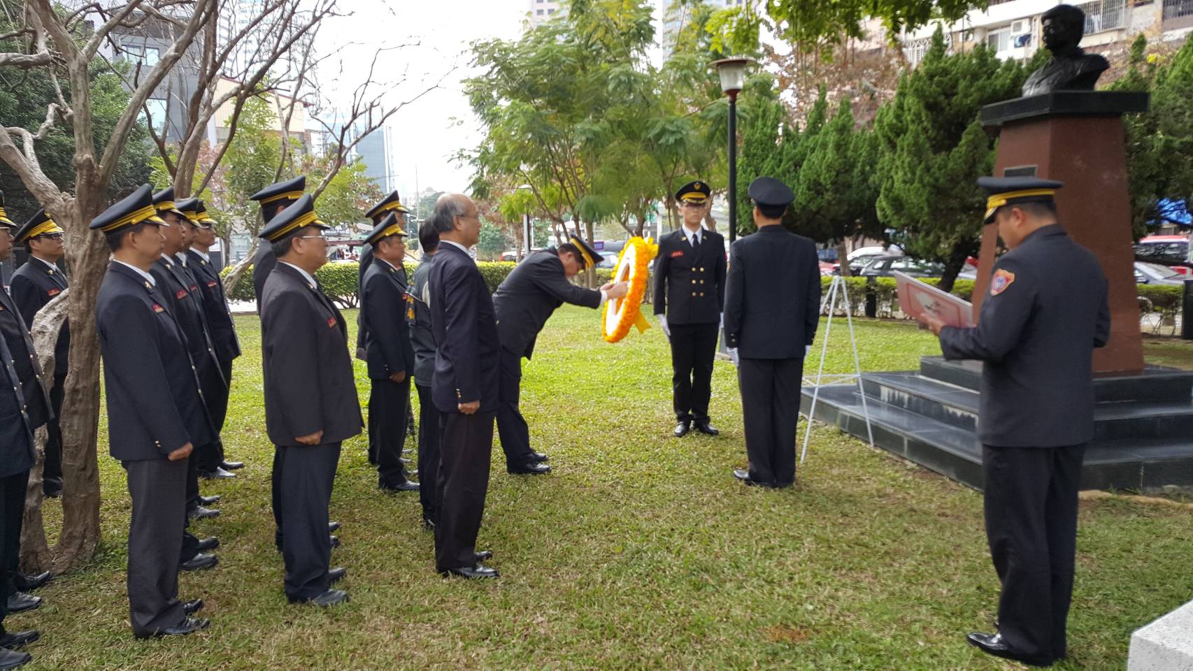 蕭局長今日前往3處追思悼祭地點,分別位於北區忠烈祠、北區英才公園及南區崇倫公園,在已故副分隊長郭寬雄、分隊長傅家森及小隊長李啟榮、副分隊長郭寬雄、小隊長陳俊宏銅像前,悼念他們在執勤過程中奮不顧身搶救人命的英勇作為。