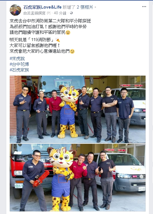 此外,花博吉祥物「來虎」也在石虎家族Love&Life臉書,分享到台中市消防局第二大隊和平分隊探班的活動,「想為消防叔叔們加油打氣!感謝他們平時的辛勞!」來虎請消防員繼續守護居民,也邀請大家透過留言來表達感謝之意。