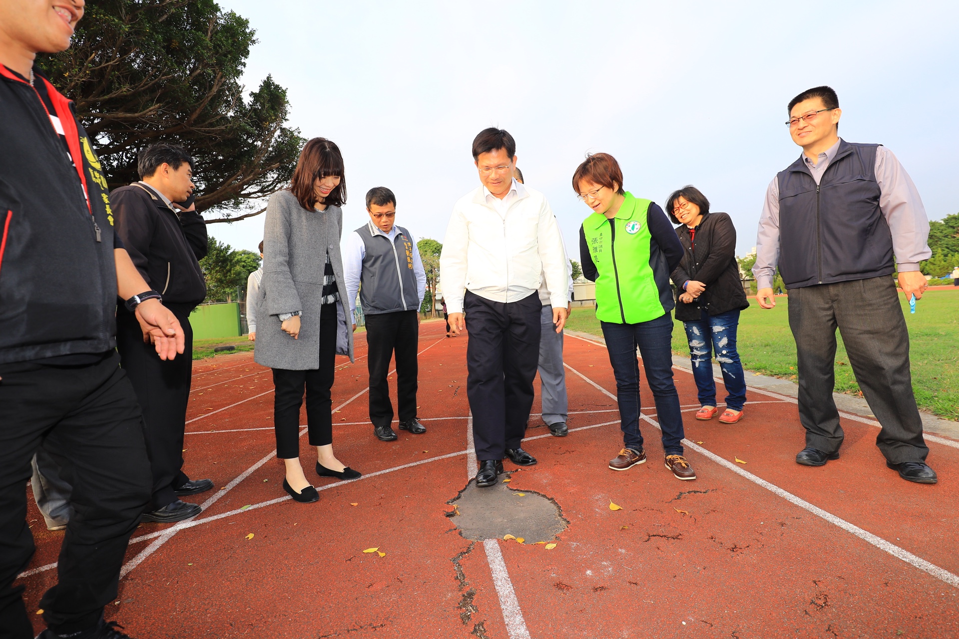 林市長今日在教育局長彭富源及校長陪同下,前往西屯區協和國小、潭子區僑忠國小及霧峰區四德國小3校會勘跑道破舊情形。立委張廖萬堅、洪慈庸,以及議員陳淑華、蕭隆澤、張雅旻、李天生、張芬郁、黃馨慧等各選區民代也到場關心。