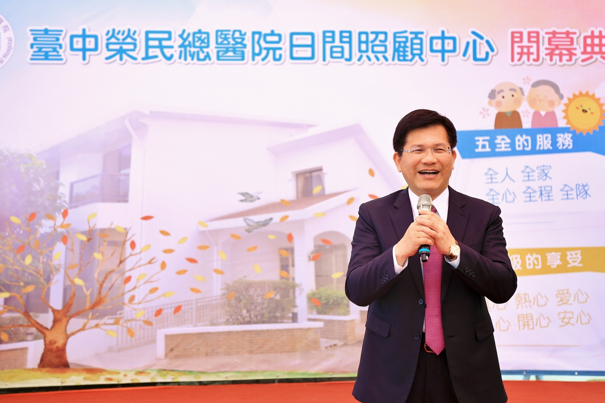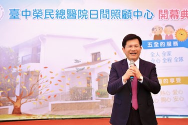 林市長表示,非常感謝台中榮總把醫療資源與在地老化、長期照顧結合,提供全人式的照顧服務,他代表市民恭喜與感謝台中榮總日照中心開幕;退輔會過去對榮眷的照顧有許多經驗與資源,並有相當多的建物與空間利用,長照2.0在醫院機構及地方診所等已有的醫療資源及社區的共同參與下,將提供民眾更完善的服務。