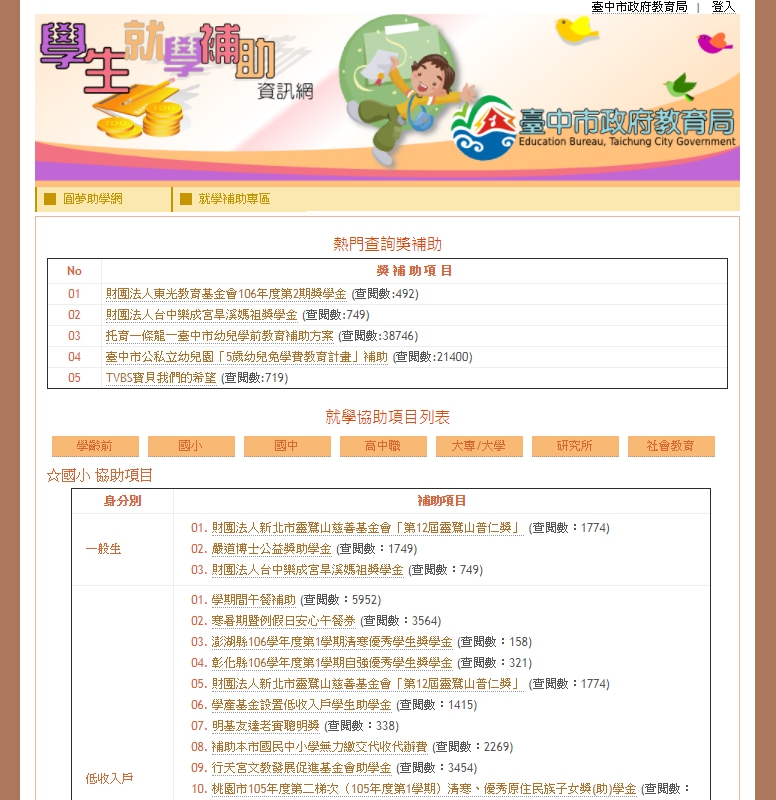 學生就學補助資訊網網址 https://www.tc.edu.tw/grants/list ,有需要的民眾可上網查詢。