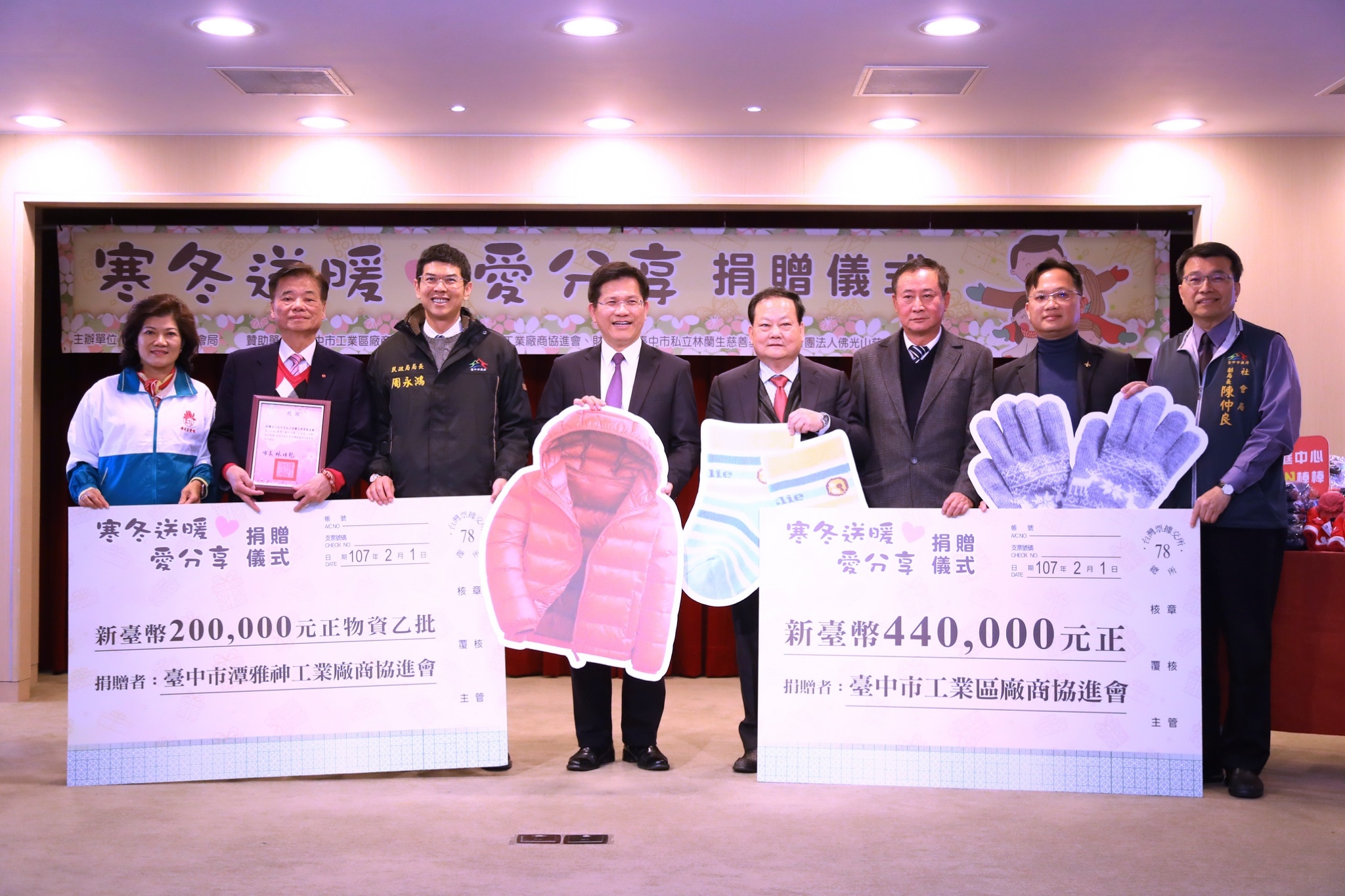 「愛心不嫌多!」林市長說,期盼能藉由今日的捐贈拋磚引玉,吸引更多企業響應,在寒冷的冬天分享愛與溫暖,照顧到社會每個角落,希望共同讓台中成為充滿愛心的城市。(2/1*13)*社會局