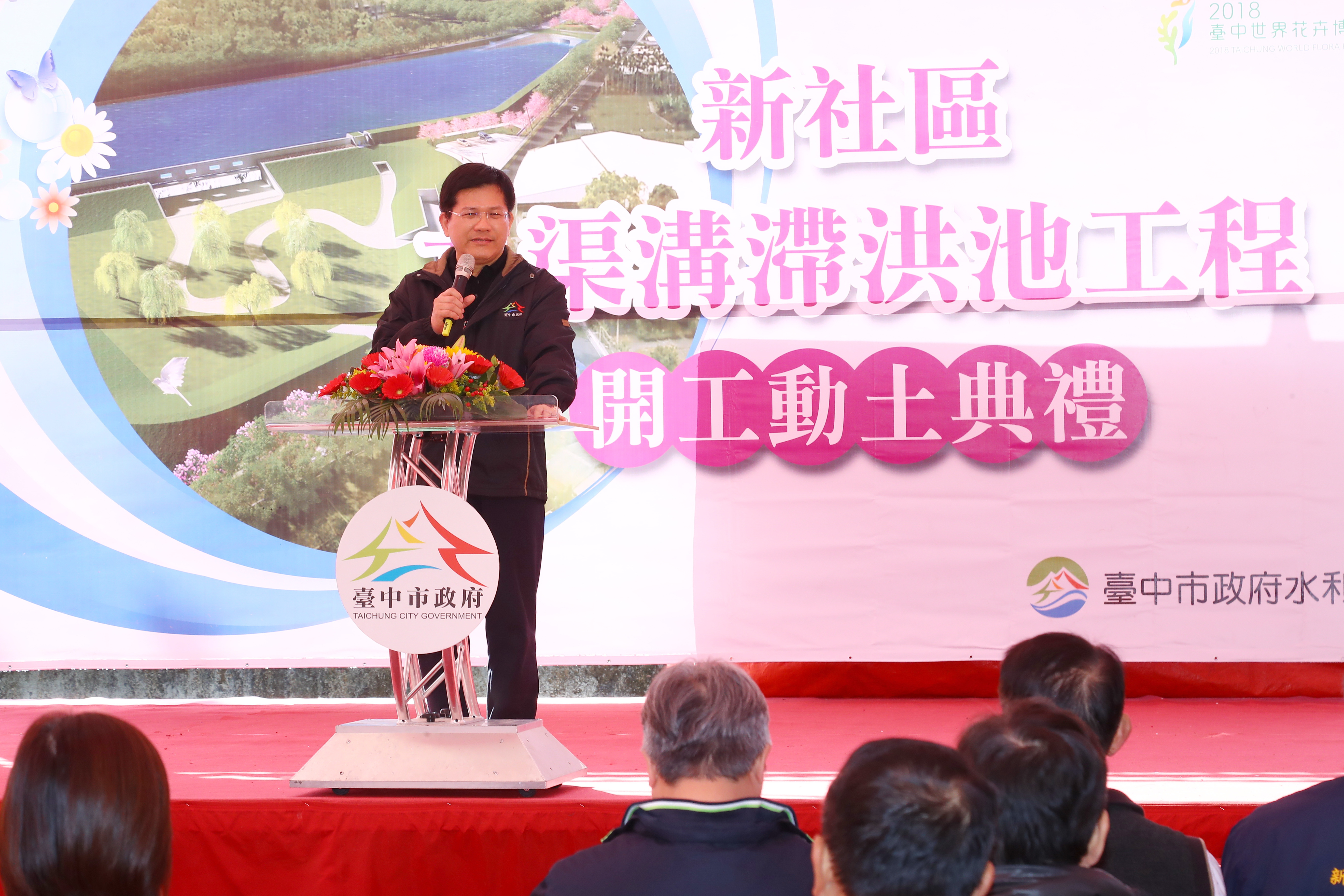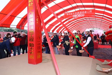 台中市政府水利局於今日舉行「新社區九渠溝滯洪池工程」開工動土典禮,市長林佳龍、水利局長周廷彰、行政院農委會種苗場長張定霖、市議員曾朝榮、蘇慶雲等人皆到場共襄盛舉;立法院副院長蔡其昌、立委江啟臣、市議員蔡成圭等服務處代表也到場關心。周局長簡報工程規劃及施工期程,完工後不僅能解決淹水、缺水問題,還能配合新社花海,打造親水環境、帶動觀光效益。