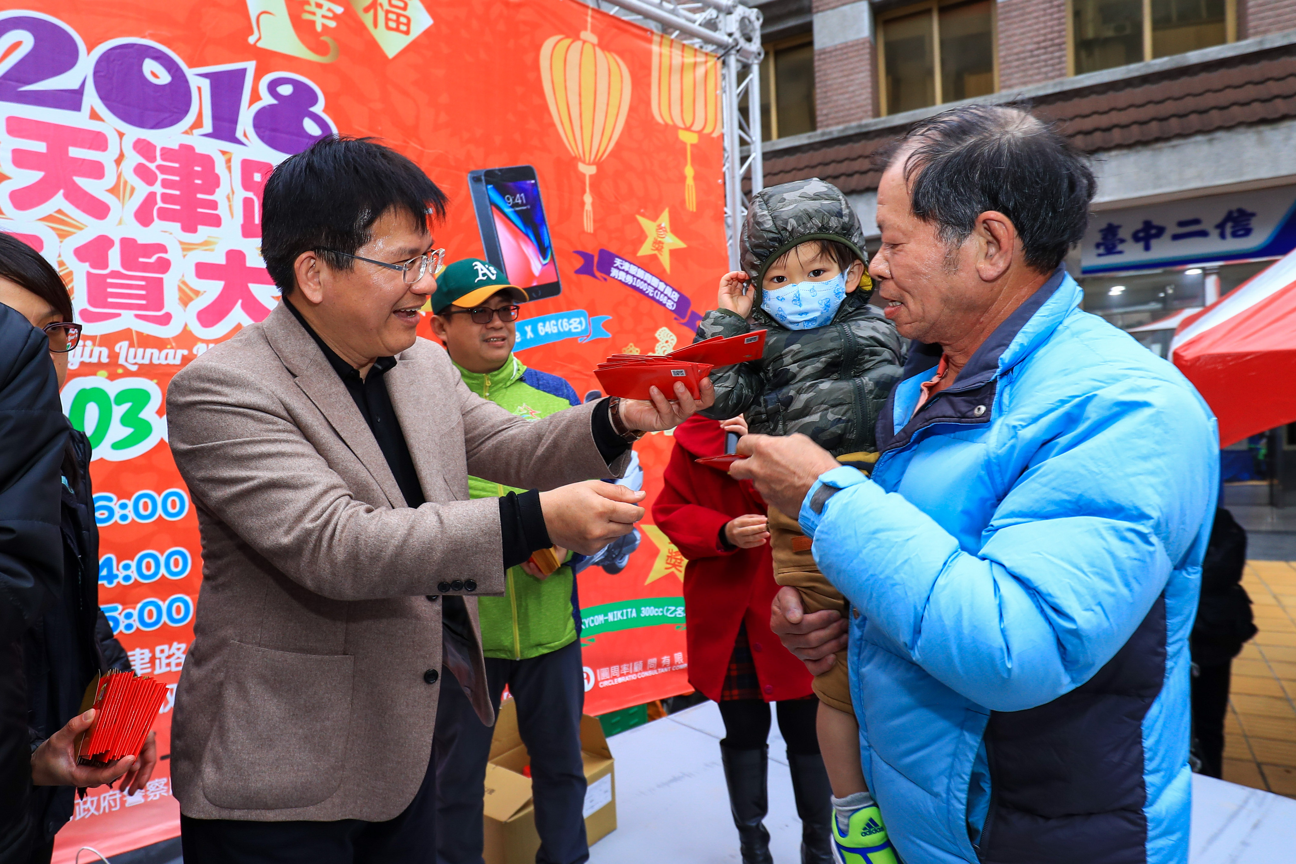 林市長準備888個狗年小紅包,並搭配天津路商圈自製紅包一起發送,祝福大家新年快樂,紅包房屋造型相當可愛,吸引大批民眾排隊領取,市議員賴佳微、范淞育也到場致意。
