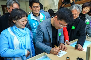在觸覺展區體驗中,林市長以綠川的水磨成的墨汁來書寫明信片,當場寫下「綠柳成蔭,川游不息」四字,期許綠川、柳樹可以庇蔭市民,走在綠川水岸中,無論是水、魚或人都能自由移動,生生不息。