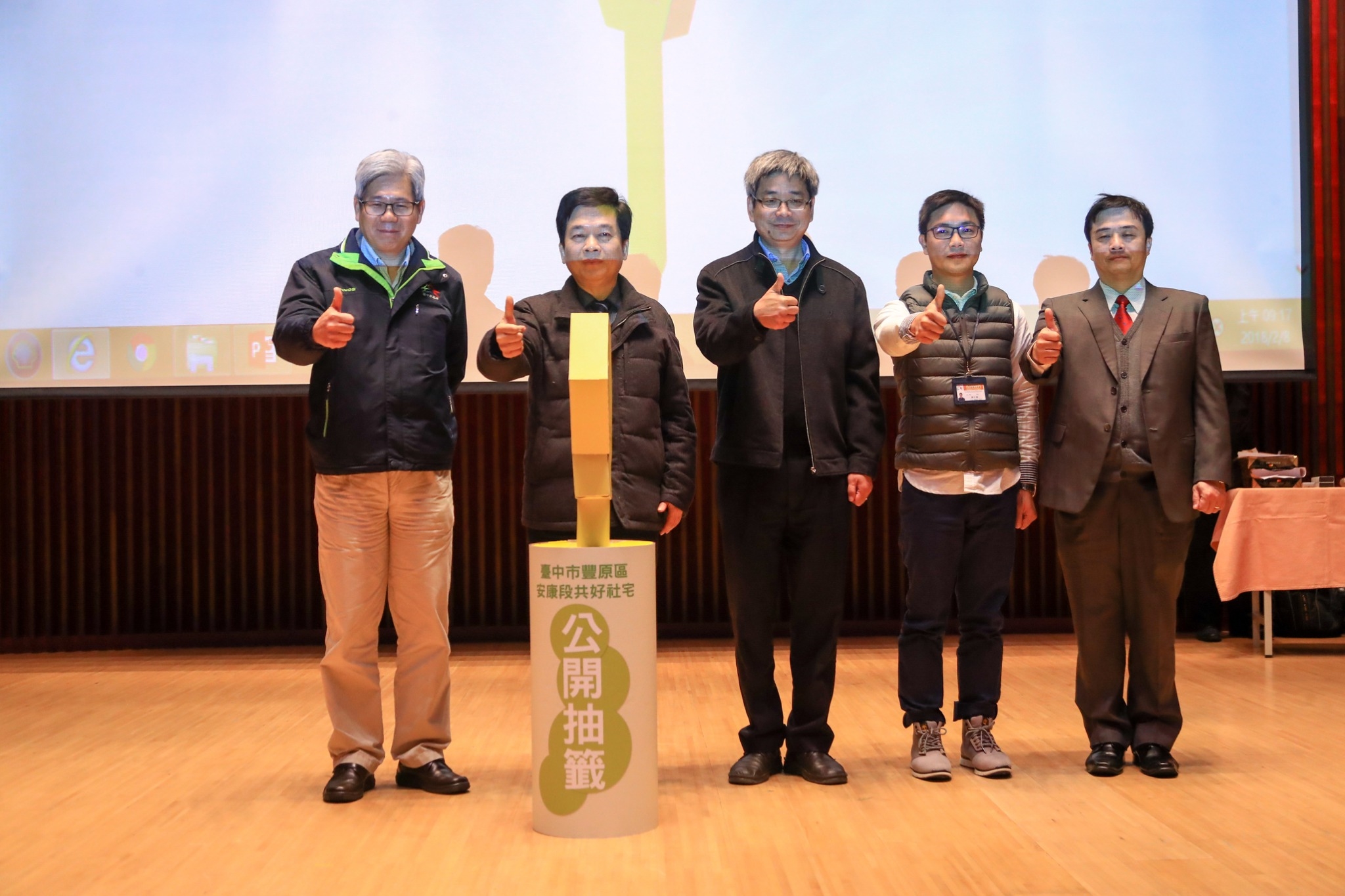 台中市政府都市發展局今日在台灣大道市政大樓辦理抽籤作業,由秘書長黃景茂、都發局長王俊傑、住宅處長許由興、住宅處政風室代表及1位律師共同參與監籤,抽籤過程公平公正公開,市議員陳本添也到場關心。