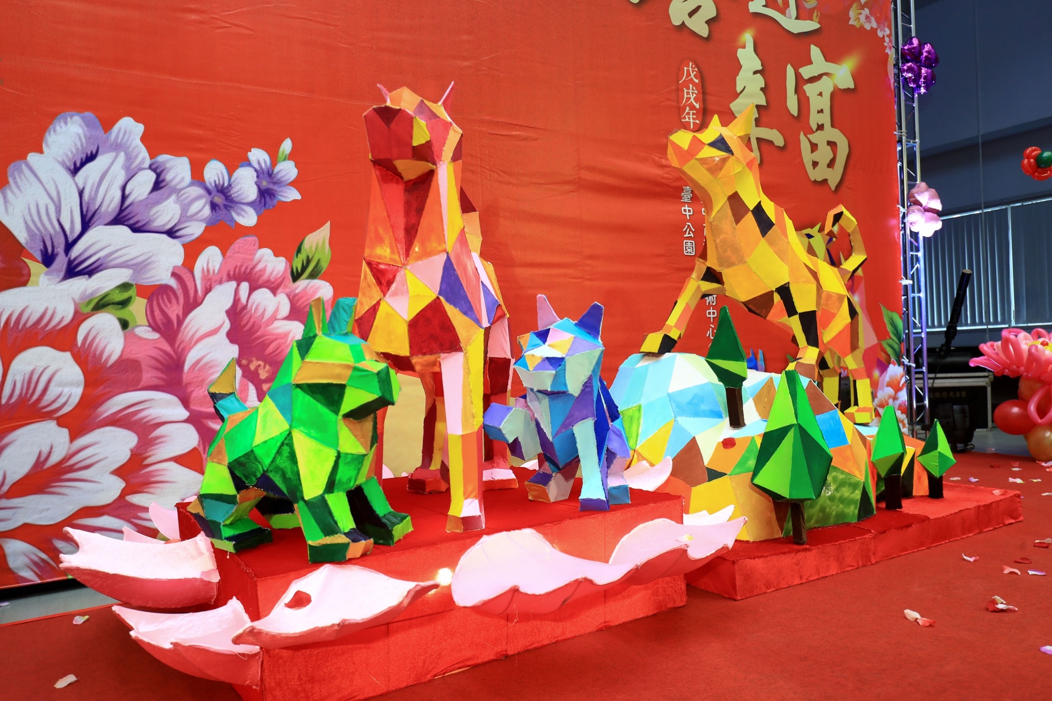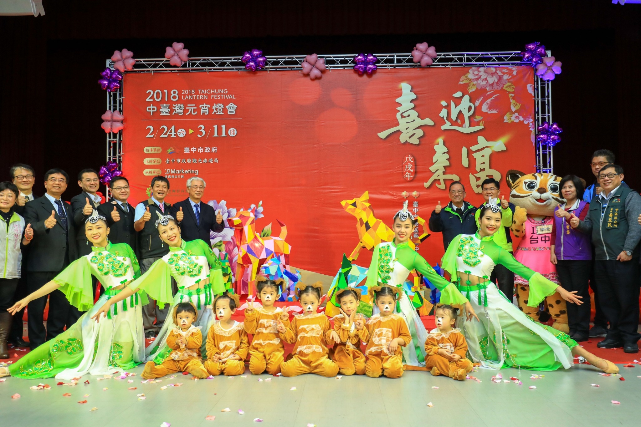 林副市長指出,今年燈會主題為「喜迎來富」,兩個場地的主燈,分別是台中公園12米高的「福旺中台」,呈現公犬雄赳氣昂登高遠眺的意象,以及清水港區藝術中心11米高的「祥旺花都」,以母犬守護兩隻可愛幼犬的造型為設計;兩座主燈均以「旺」字命名,除了呼應107年是狗年,更期盼台中的經濟可以更「旺」。而每晚7時至10時整點還有「喜迎來富」主燈秀,歡迎民眾在燈會期間來走元宵、祈平安。