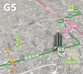 交通局表示,G5站位於北屯區東山路與文心路所連貫的東西向軸線帶上,面積591坪,是捷運綠線進出大坑、新社地區的重要門戶,且基地位居G4及G6站所形成的雙十軌道路網中心,未來可一站轉乘台鐵及雙港輕軌,周邊還有知名的北屯兒童公園及B&Q特力屋、大買家大型量販店,區位潛力可期;預計可興建地上23層、地下5層開發大樓,未來總銷金額預估可達22億元。