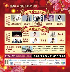 今年中台灣元宵燈會從即日至3月11日,在台中公園及港區藝術中心以雙主燈模式登場,除了主燈外,雙燈區有19組主題燈、3組互動科技燈,以及7組水上裝置藝術燈,每組花燈都各具特色;更特別邀請日本青森縣平川市5米高的「扇形睡魔花燈」首度到台中展出。