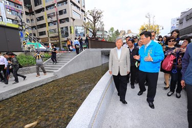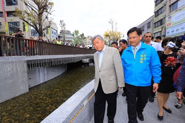 新竹縣邱縣長率縣府秘書長、參議及局處長等約70人,今日來到台中參觀剛完成整治並開放參觀的綠川。林市長與副市長林陵三、水利局長周廷彰等人共同接待表示歡迎。林市長向邱縣長介紹綠川整治的工程特色,隨後也轉往柳川參觀。
