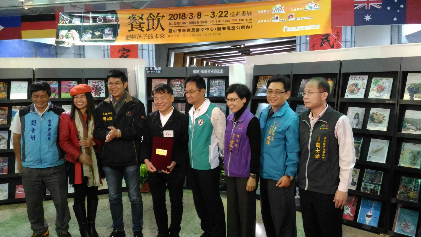 市府民政局與益品書屋透過政府與民間合作模式,於台中市新住民藝文中心建構友善的學習平台,今(8)日舉辦「餐飲,翻轉孩子的未來巡迴書展」開幕活動,民政局長周永鴻出席外,包括益品書屋創辦人戴勝益、市議員張耀中、劉士州等人也與會共同為活動宣傳。