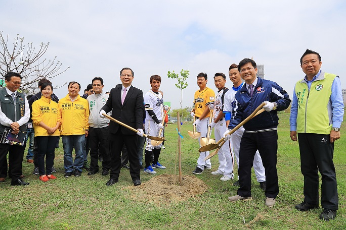 台中市政府持續推動「8年100萬棵植樹計畫」,獲各界共同響應。適逢植樹節將到來,市府今(9)日結合中華職棒29年例行賽前熱身活動,邀請多位知名球星一起植樹,以公益環保的形式宣告球季即將開打。市長林佳龍表示,棒球運動不只為個人帶來健康,也讓社會更健康,期待全民一起種樹,提高生活品質外,共同推動環保、生態環境的改善。
