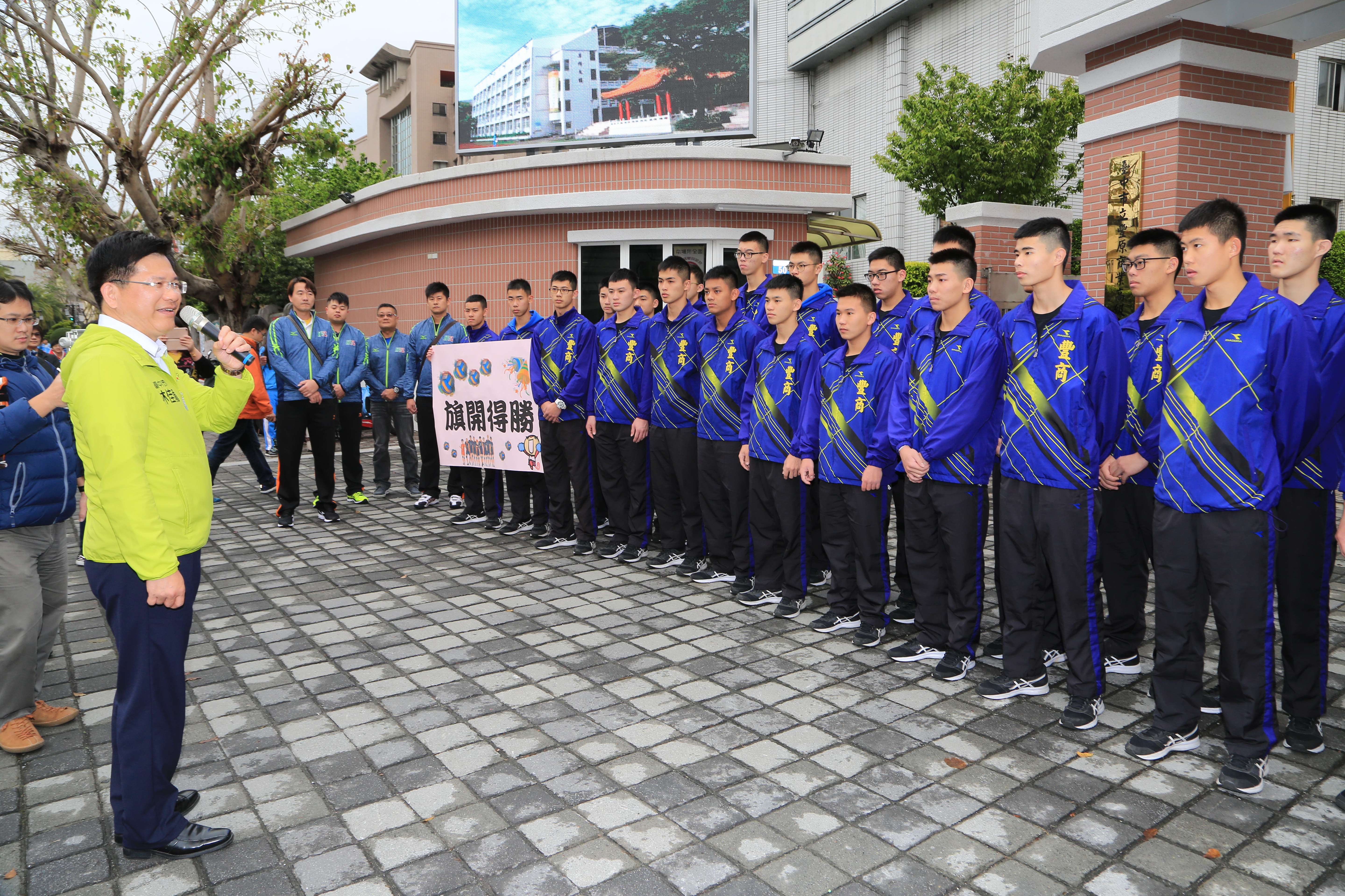 林市長今日一大早趕在豐原高商男排前往台北備戰前,到校為球隊授旗,預祝旗開得勝,並準備慰勞品給選手,期勉奪下HVL五連霸。選手上車時,並與林市長一一擊掌,士氣高昂。