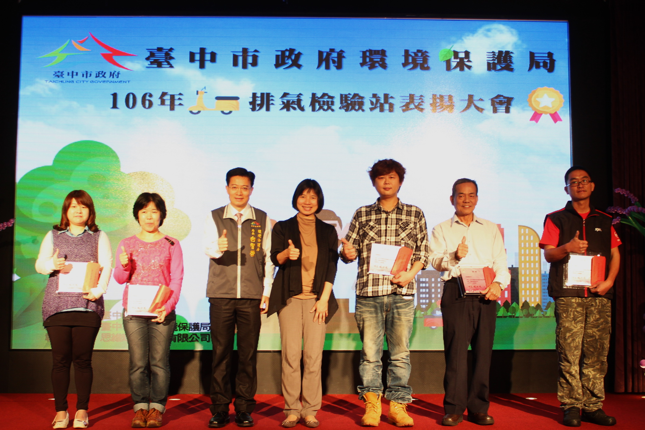 台中市機車排氣檢驗站106年評鑑成績出爐,共有30家機車檢驗站獲獎,副市長林依瑩與環保局長白智榮昨(25)日頒發獎牌及獎勵金,肯定檢驗站協助市府執行機車排氣定檢業務,促使台中106年度二行程機車淘汰輛數達到5萬9,096輛,淘汰率六都第一,有助改善空氣品質。