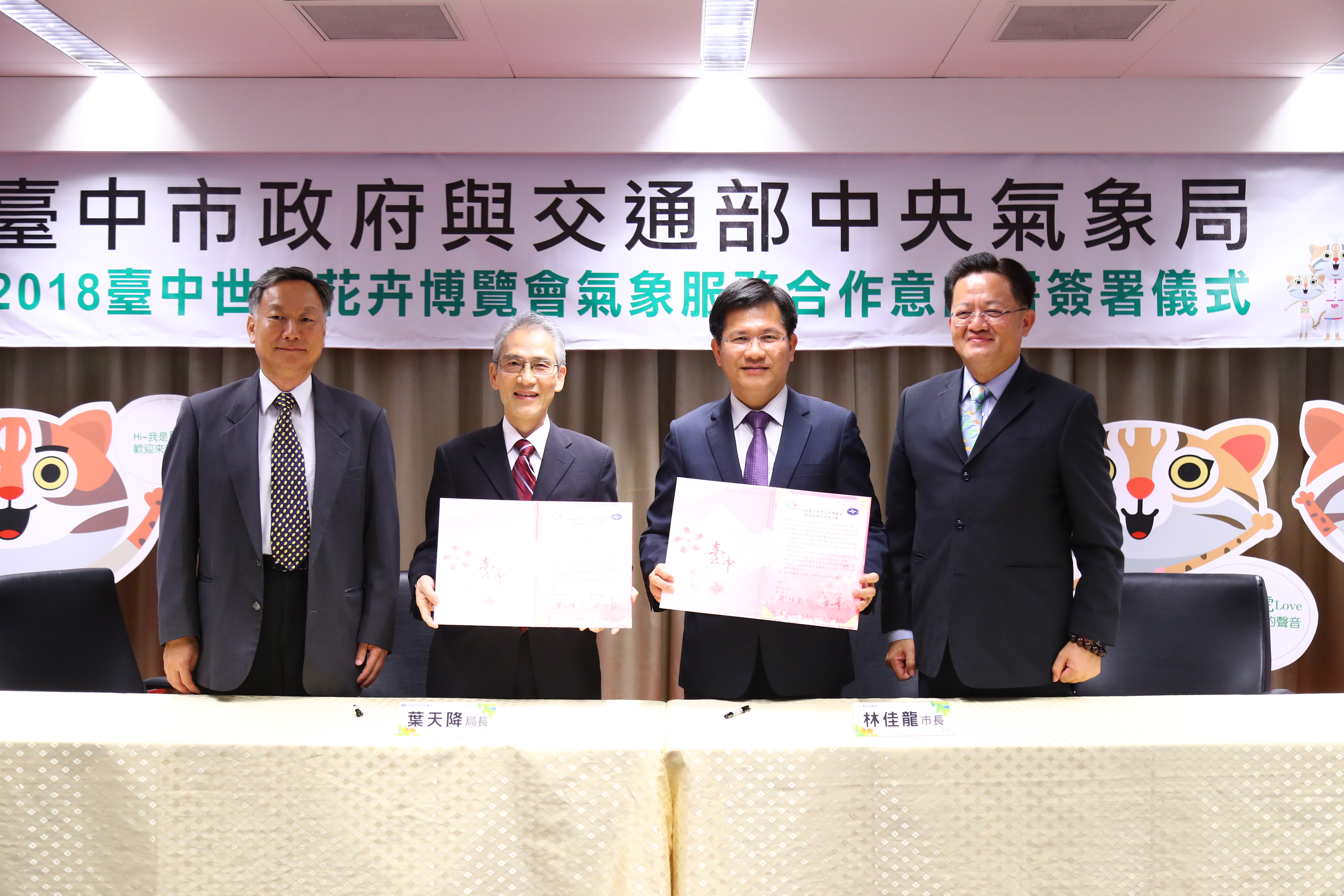 林市長今日在消防局長蕭煥章陪同下,與中央氣象局長葉天降共同簽署「2018台中世界花卉博覽會氣象服務合作意向書」,在花博期間將由中央氣象局提供全程、定點且持續性的氣象預測服務,並在中央氣象局網頁建置花博專屬頁面。