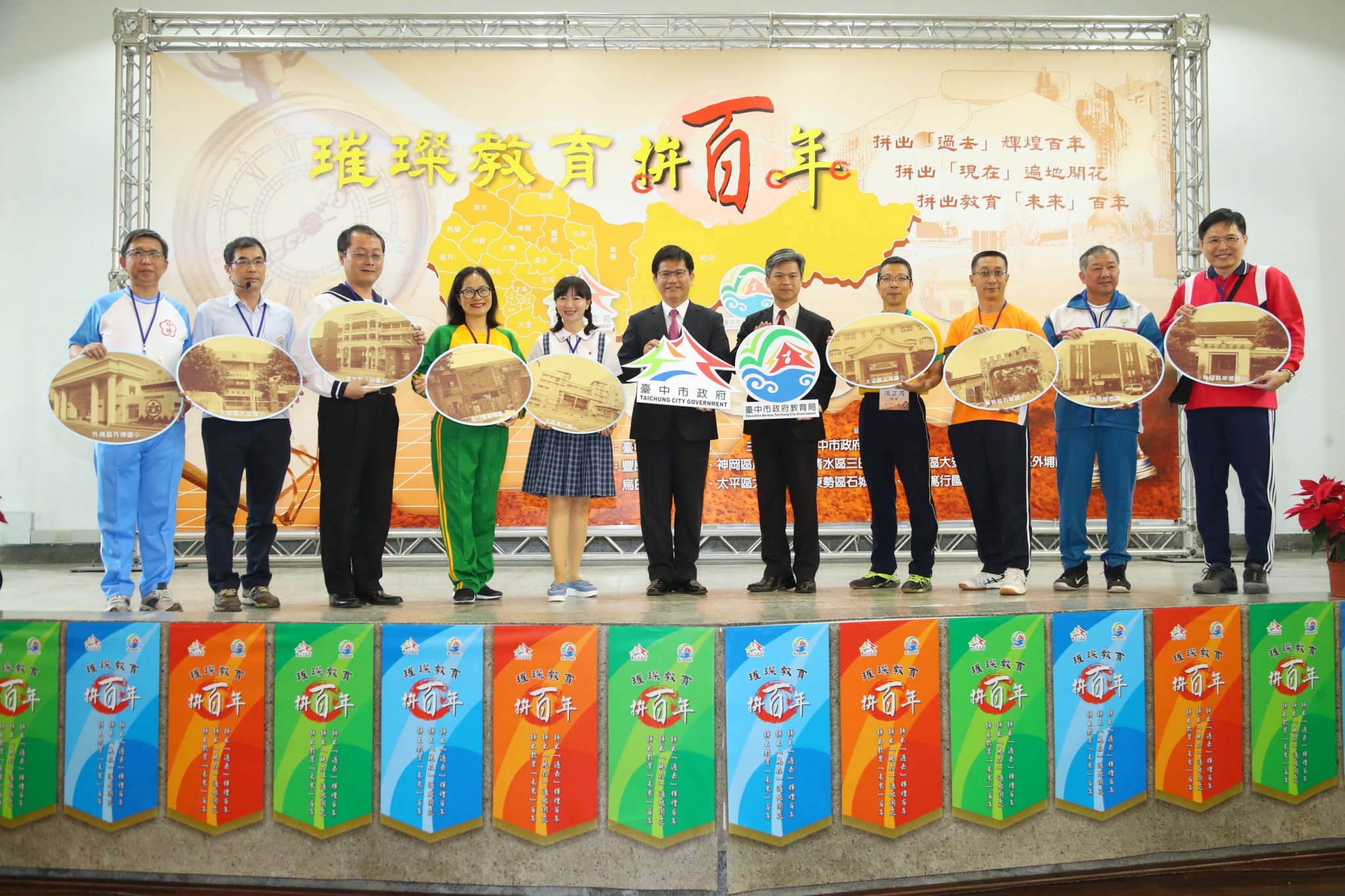 林市長與教育局彭局長及9校校長共同拼出環狀的大台中教育地圖,象徵教育「過去」輝煌百年、「現在」遍地開花及「未來」百年展望,並參觀教育文物展。林市長表示,教育是「十年樹木,百年樹人」的志業,今年台中市有9所學校迎接百年校慶,透過與滿百歲的學校聯合舉辦文物展,回顧已走過百年的教育歷史,也展望美好未來。