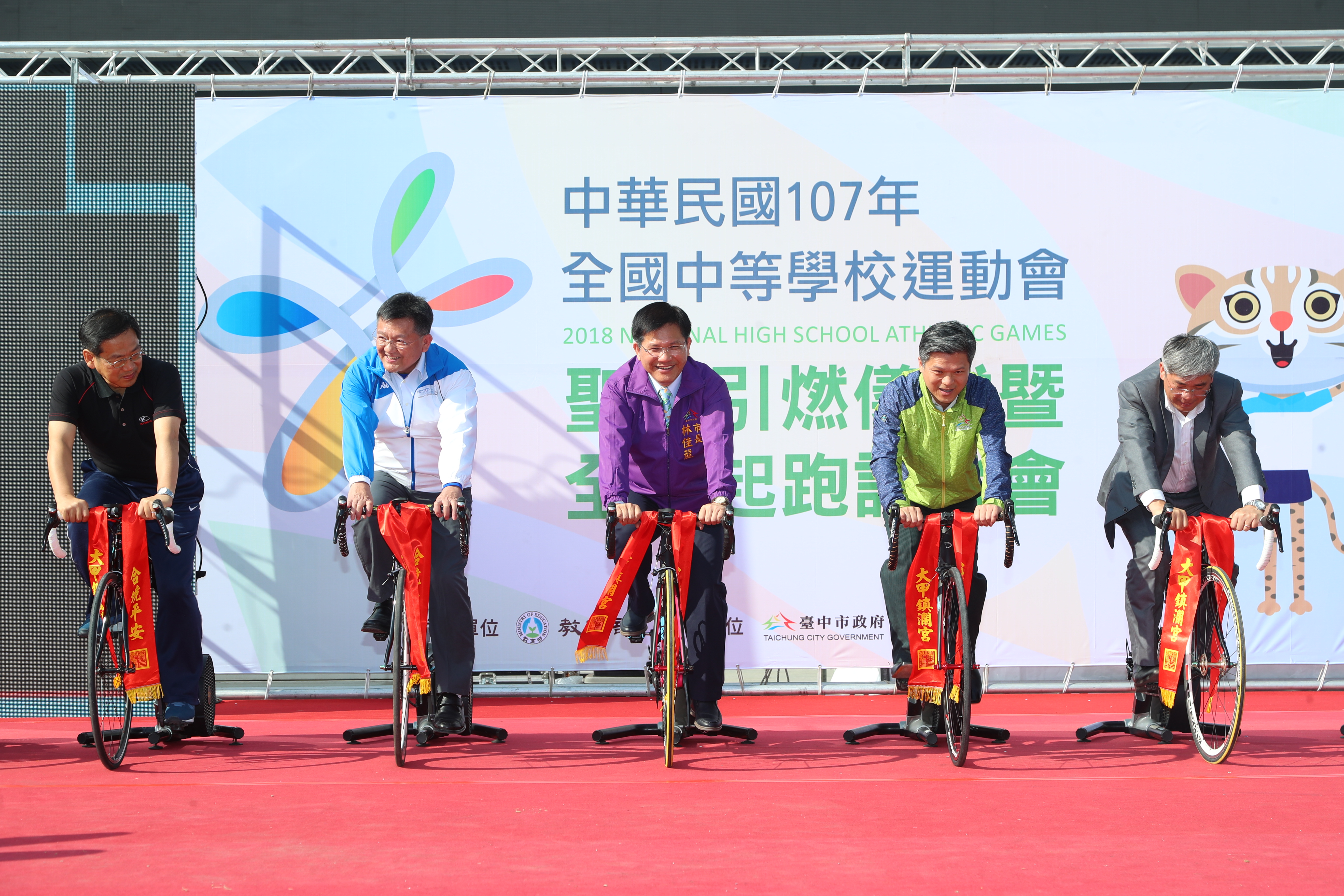 昨日副市長林依瑩至大甲鎮瀾宮向大甲媽祈求接引聖火母火,市府教育局今日在台灣大道市政大樓府前廣場舉辦「107年全國中等學校運動會聖火引燃及全國起跑記者會」,由林市長、教育部體育署副署長林哲宏、市府教育局長彭富源、運動局長王慶堂等人,利用動能轉電能方式,合力踩動自行車,點燃107年全中運母火座。