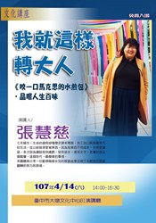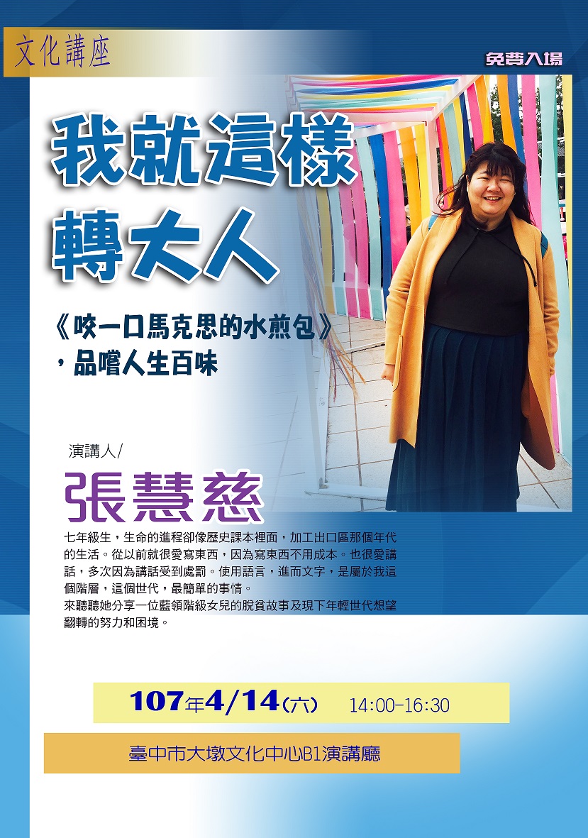 明(14)日下午2點在大墩文化中心邀請到張慧慈演講,出身於典型工人階級家庭,張慧慈的成長過程一路顛簸,經歷無數歧視與磨難,從有意識起,雙手就忙著做家庭代工,中學時代當過女工,大學後靠著好文筆,四處申請獎學金貼補家用,邀您來聽聽她分享生命經歷,見證現下年輕世代努力翻轉困境,活動亦安排網路人氣作家吳曉樂主持,講座免費入場。本週還有不少展覽、演講等活動,更多資訊,請見「中市週末活動看板0414_0415」。(4/13*6)*新聞局