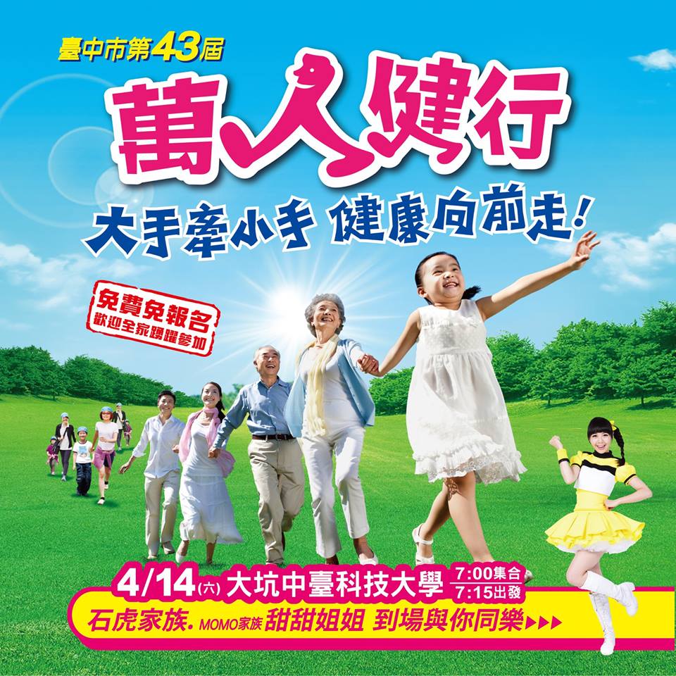 台中市第43屆萬人健行大會將於明(14)日從大坑風景區展開,今年以「大手牽小手、健康向前走!」為主題,鼓勵家長帶著全家大小走出戶外、親近大自然,當天除有台中世界花卉博覽會吉祥物歐米馬到場外,也邀請MOMO親子台「甜甜姐姐」帶動唱,更有筆記型電腦、iPad、大坑商圈會員店家消費券等總價共超過10萬元的摸彩贈品,並將提供免費的大會帽給參加民眾索取,活動免費、免報名自由參加!