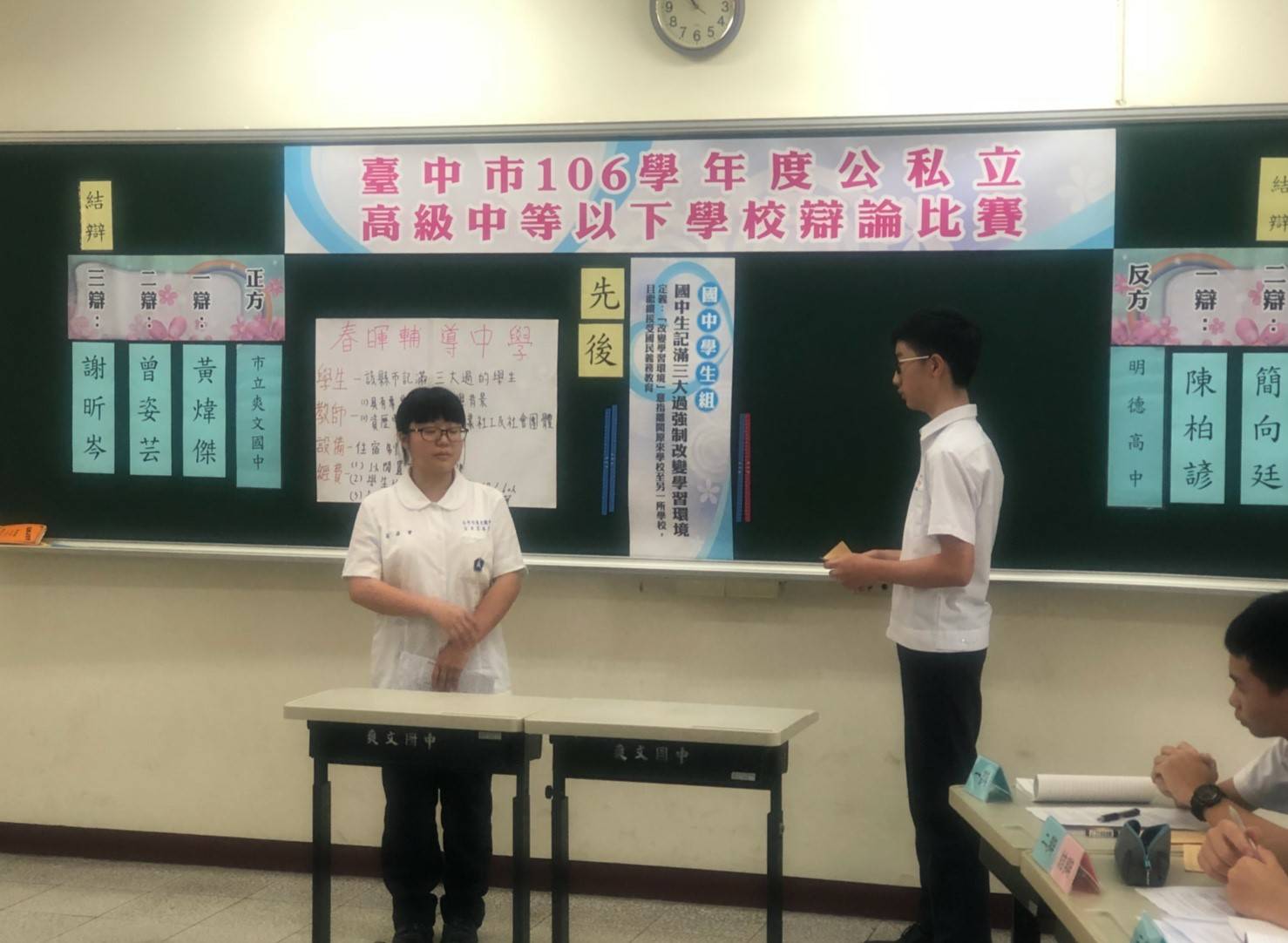 106學年度賽事今、明兩日在爽文國中舉行,獎項分為團體獎及個人最佳辯士獎,鼓勵小辯士們盡力表現,並為團隊爭取佳績,希望學生能關心社會,並對普世價值與事實進行批判、反思。(4/14*8)*教育局