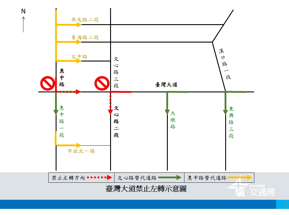未來文心路口禁止左轉後,用路人仍可於文心路上游路口左轉東興路、大墩路,或下游路口左轉惠中路;惠中路往南方向禁止左轉後,則可提前左轉青海路,或於下游左轉市政北一路。交通局將把文心路及惠中路實施成果納入檢討後,進一步評估英才路、健行路、黎明路等路口左轉管制策略。
