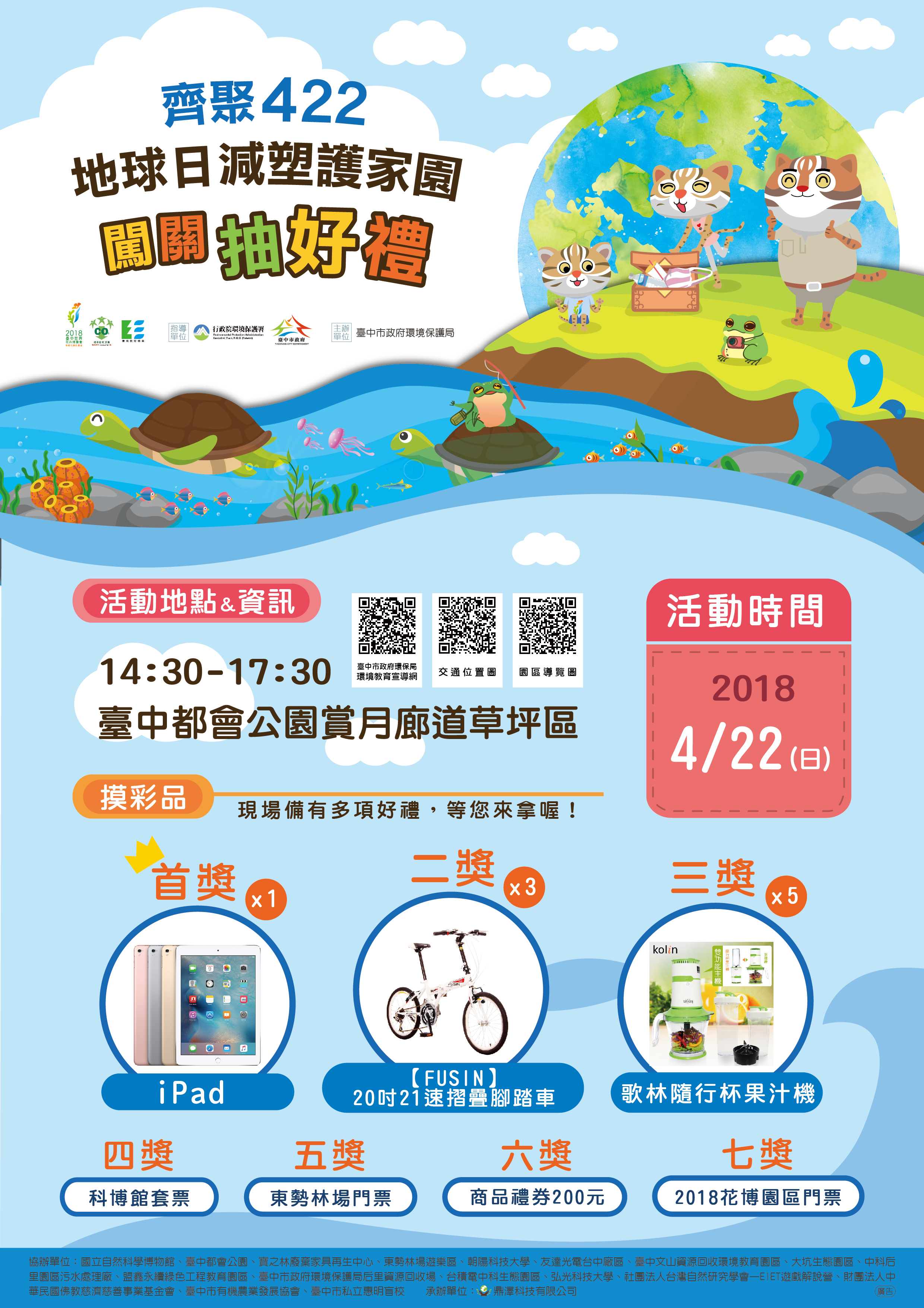 為宣導減少使用塑膠用品,降低環境負荷,台中市政府環保局將於4月22日世界地球日(Earth Day)於台中都會公園舉辦環境教育宣導活動,邀請惠明樂團及大專院校學生社團演出,並舉辦環境教育闖關遊戲,參加民眾將可獲得精美小禮物,歡迎踴躍參加。