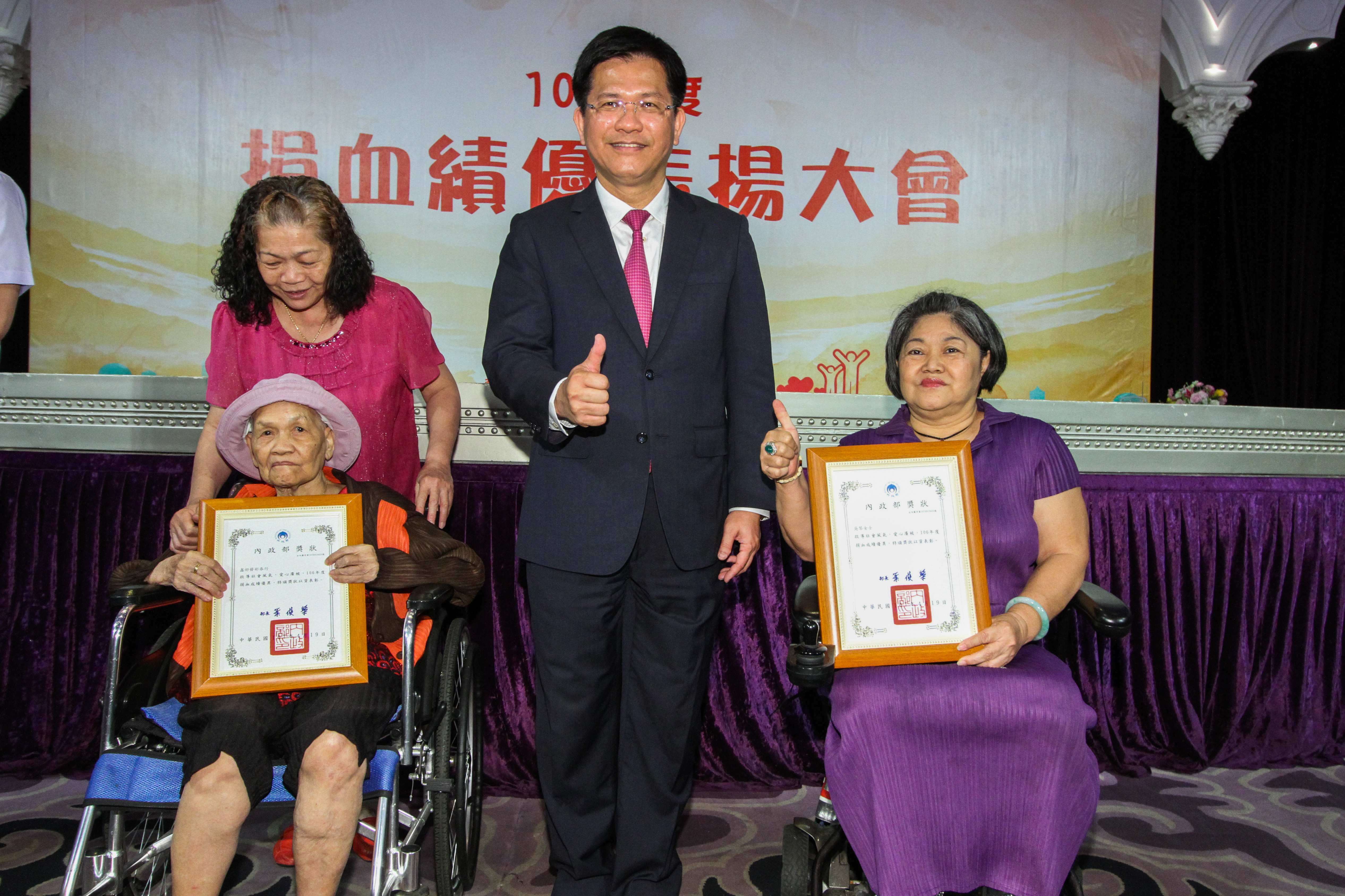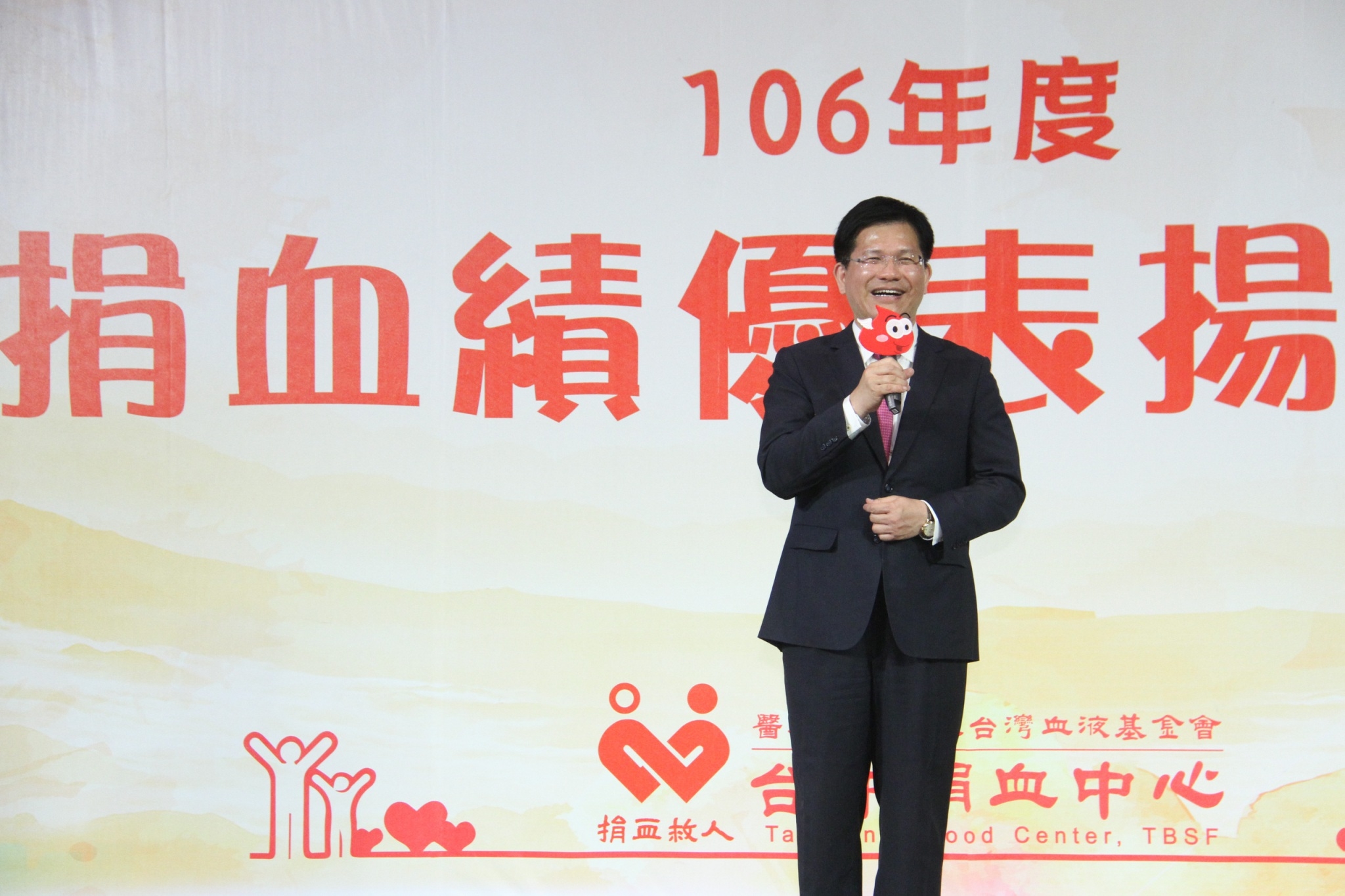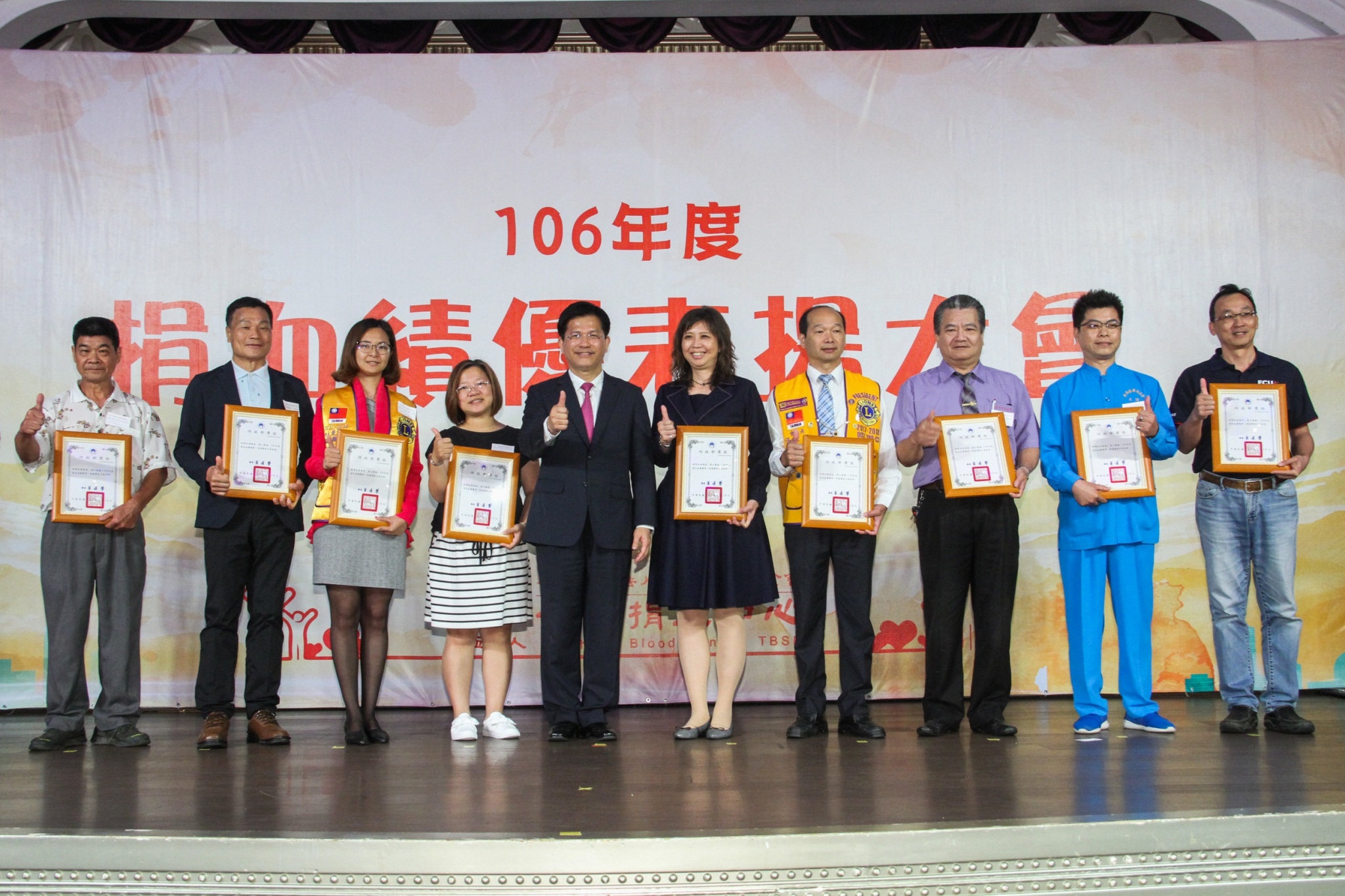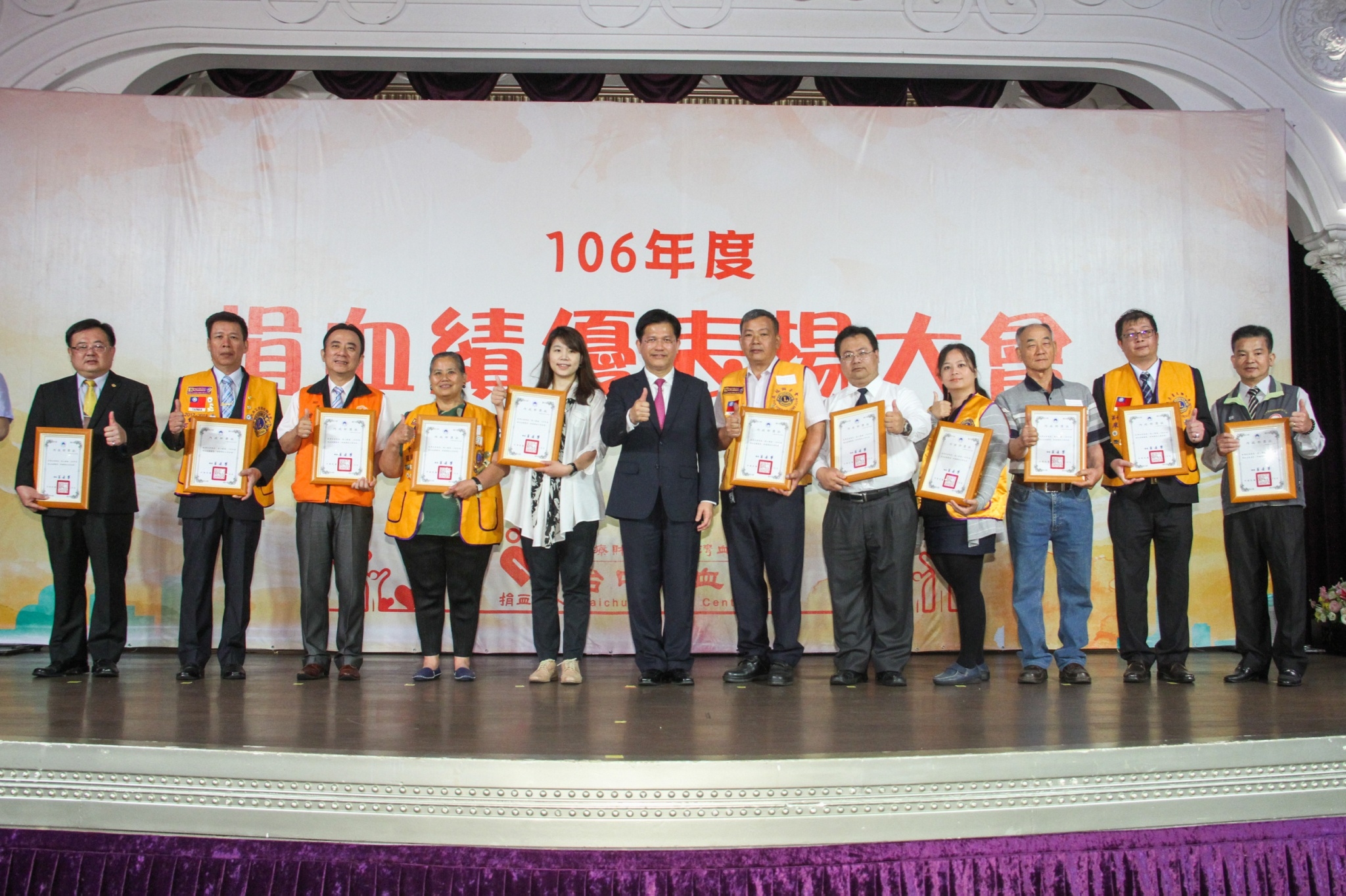 在捐血人踴躍愛心挽袖捐血下,台中捐血中心去年總捐血數達52萬231袋。今(25)日舉行106年度捐血績優表揚大會,共140個團體單位、14個學校單位、7個軍方單位及14個特殊貢獻單位,以及個人組1,066位百次以上分離術捐血人、2,105位百次以上全血捐血人獲獎,市長林佳龍應邀頒獎。他感謝捐血人捐出熱血,有了大家的投入,讓社會充滿正向力量與善循環,呼籲更多人投入捐血行列。