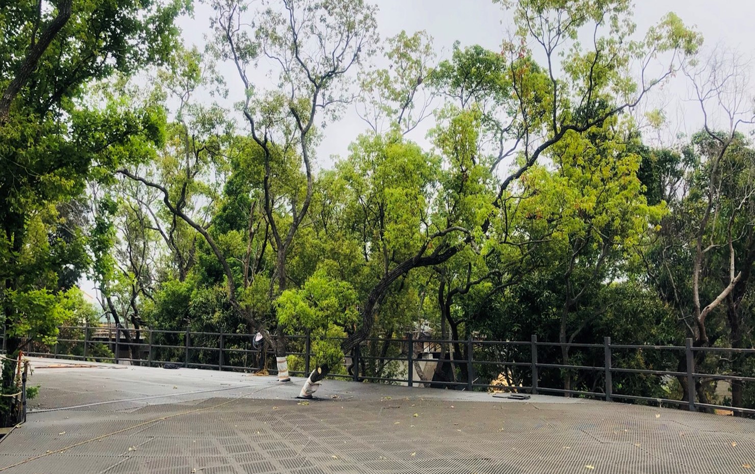 建設局指出,因整體園區規劃樹林現地保留,空中步道引橋避開樹木彎曲施作。橋面以半簍空鍍鋅鋼網,可看到橋面下方綠樹,若遇樹木難以避開,橋面則以開口方式繞開,讓綠樹原地生長。