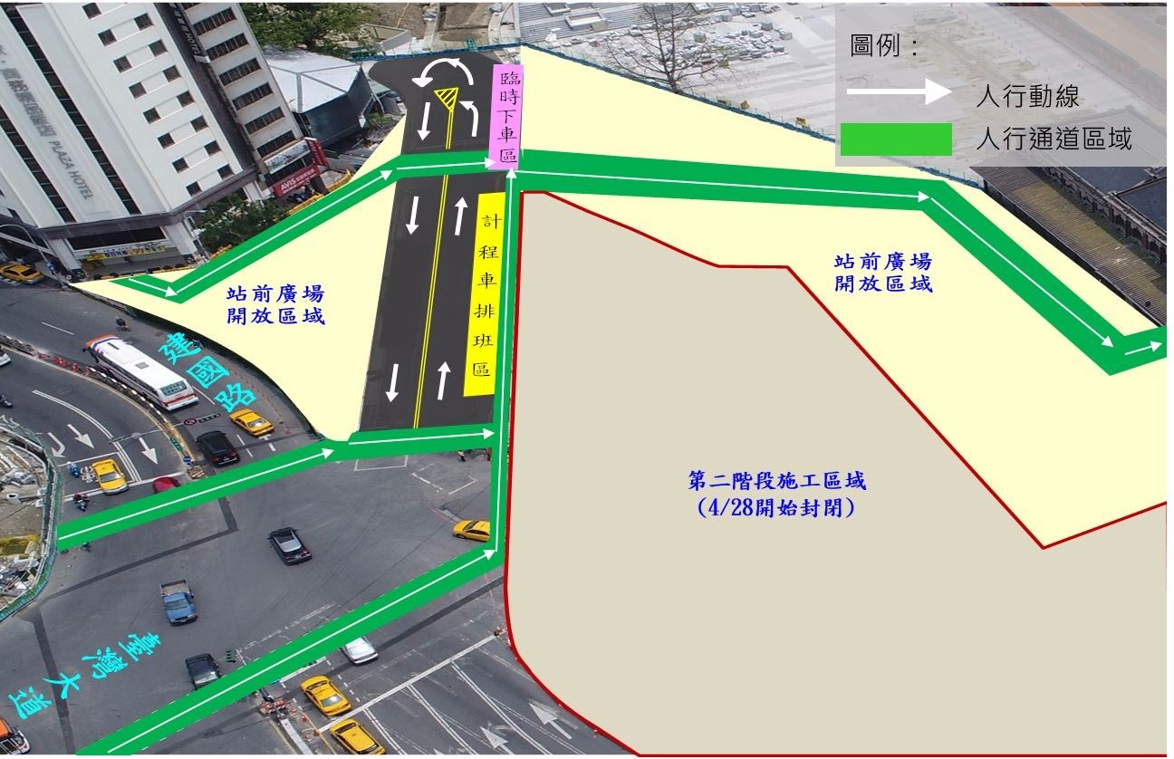王局長說,為讓民眾減少步行路程,廣場仍維持2條人行通道,並將現有人行通道加寬,1條是目前通往金沙百貨對面搭乘公車的既有動線,1條則為4月19日協調建設局提早開放的廣場內便道,兩條便道最小寬度皆超過3公尺,最寬可達8公尺。來自建國路以東及國光客運轉搭乘火車的乘客,可透過左側人行通道,沿綠斑馬線及指標進入火車站;來自建國路以西及公車轉乘的乘客,可從新開放的人行通道進出火車站。