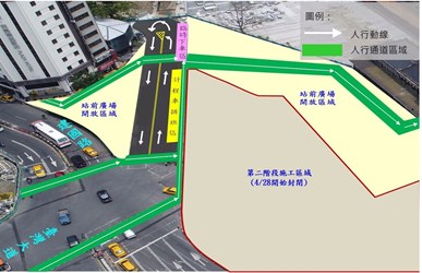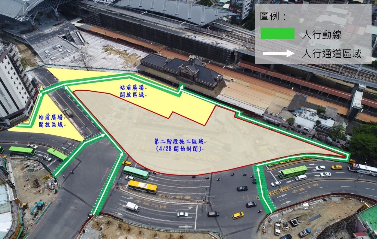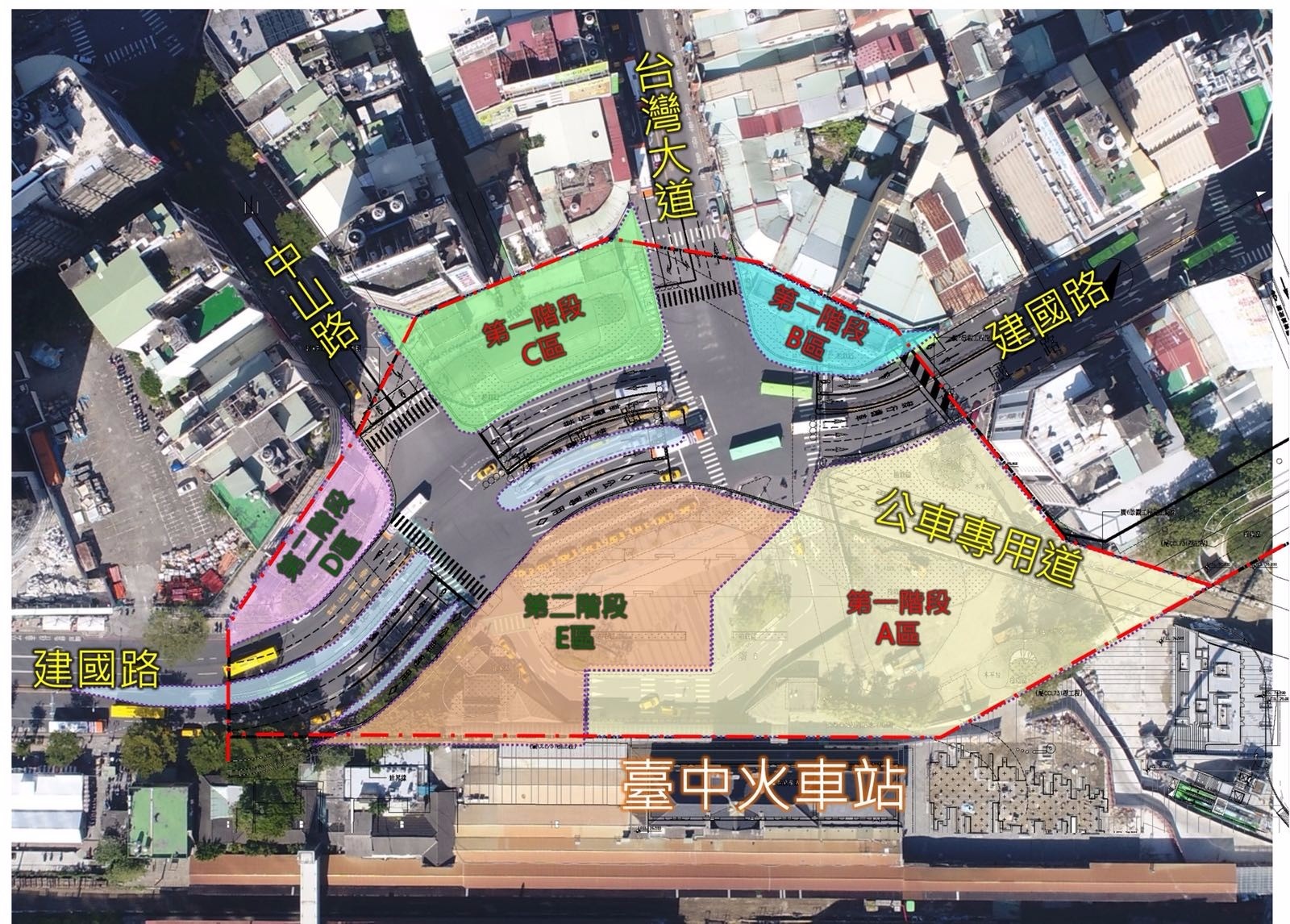 「台中車站廣場(廣6)工程」第二階段D、E區原定5月中旬才開始施工,建設局邀集鐵改局、交通局、警察局及管線單位共同檢討工序及管線遷移協調後,提前於3月中旬局部施作,並於4月19日提前開放第二階段人行動線,以利進出舊火車站通往新站搭車,降低施工期間的不便與交通影響。