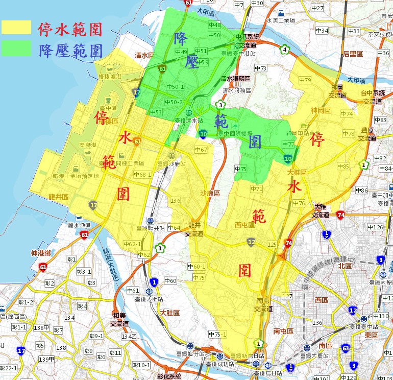 為穩定大台中地區原水供應,台灣自來水公司整合辦理「五合一工程」施作,將自5月5日上午10時起至5月7日上午3時止停水,影響時間計41小時,影響區域有11個行政區,包括神岡、潭子、大雅、西屯、南屯、烏日、沙鹿、龍井、大肚、梧棲區等多個里,以及台中港區台中港、加工區及關連工業區、清水區(臨海路以西),提醒民眾提早儲水備用,並配合節約用水、關閉抽水馬達電源,以免空轉造成損壞或火災,社區大樓請通知社區機電人員於停水前將蓄水池、水塔蓄滿,造成不便請市民體諒。