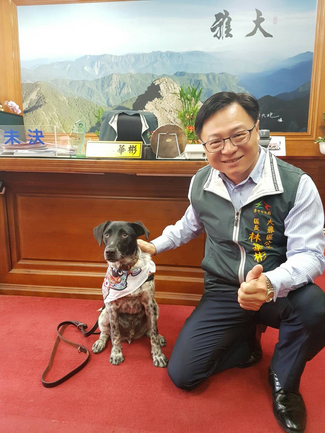 大雅區公所昨(26)日舉辦友善寵物空間揭牌活動,區長林華彬邀請動物之家培訓犬PUMA到公所擔任1日區長,並與洽公民眾互動,現場氣氛輕鬆愉快。區長林華彬表示,他相當喜歡動物,過去在擔任環保局南屯區清潔隊長時,就曾號召同仁一起代養流浪犬貓,期盼更多人加入動物保護行列,讓更多動物受到照顧。