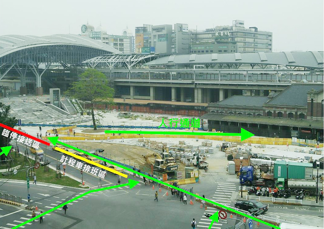 今日起,火車站前臨停接送區及計程車排班區調整至新闢道路區,並保有2條人行通道,來自建國路以東及國光客運轉搭乘火車的乘客,可以透過左側的人行通道,沿著綠斑馬線及指標進入火車站,而來自建國路以西及公車轉乘的乘客,能從右側廣場內通道,更為安全且舒適的進出火車站。