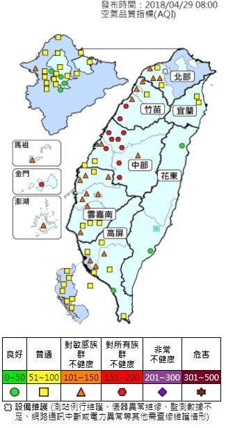 台灣中部今(29)日因受吹東風且位於背風面影響,清晨及夜間風速偏弱,大氣擴散條件稍差,從苗栗、台中、南投、彰化等地皆有空品測站,達對所有族群不健康的「紅色警示」程度,此波影響預估將持續至5月2、3日,市府已啟動一級應變,通報大型汙染源配合減排並加強巡查,台中電廠也配合降載。