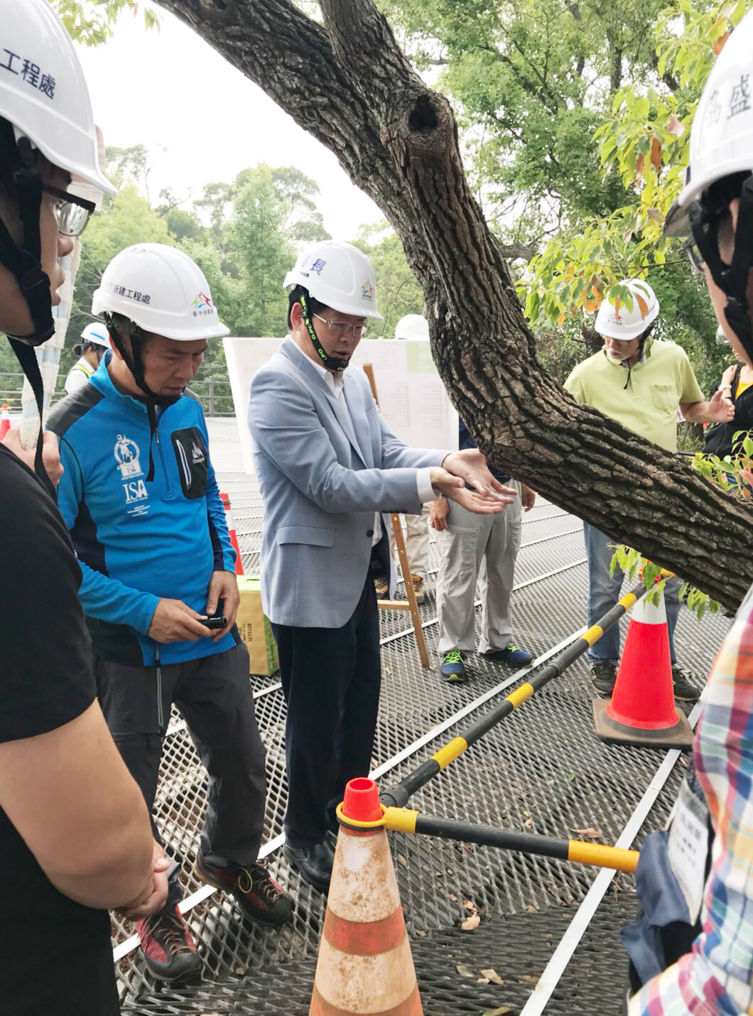 建設局長黃玉霖昨日帶著日本第2屆樹木醫有田和實院長、香港樹木拓展學會吳志雄老師、台灣樹木醫學學會理事長廖天賜及台灣愛樹保育學會會長曾檉銳等一行人,前往現勘花博后里森林園區的樹木。