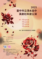 清水高中規劃於7/4,7/5,7/6辦理四場「清水高中英劇社英語戲劇年度公演」,該社團已成立26年,秉持著「打破學英語的恐懼、豐富學習經驗、推廣劇場藝術」的理念而行動,每年的演出內容結合英語戲劇、默劇、舞蹈和多媒體特效,創造出其獨有的風格,同時也希望透過這些豐富多元的劇碼,帶給觀眾新奇歡樂的劇場體驗!