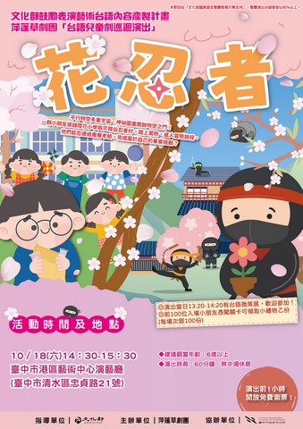 萍蓬草劇團114年全新劇作《花忍者》,源自日本兒童文學作家古田足日(1927-2014)於《代做功課股份有限公司》書中所提一段「忍者」故事。《花忍者》描述生活在忍者村卻天生喜歡種花不喜歡忍術的男孩佐平,因為學不會忍術倍受嘲笑。最終,因為一次意外,佐平不但沒有學會忍術,也失去快樂長大的機會!在編劇巧手改編下,全劇結局大反轉,同時希望家長們反思「什麼才是孩子真正喜歡的?」以及「什麼樣的學習才是對孩子最好的?」讓每個孩童都能快樂成長!
