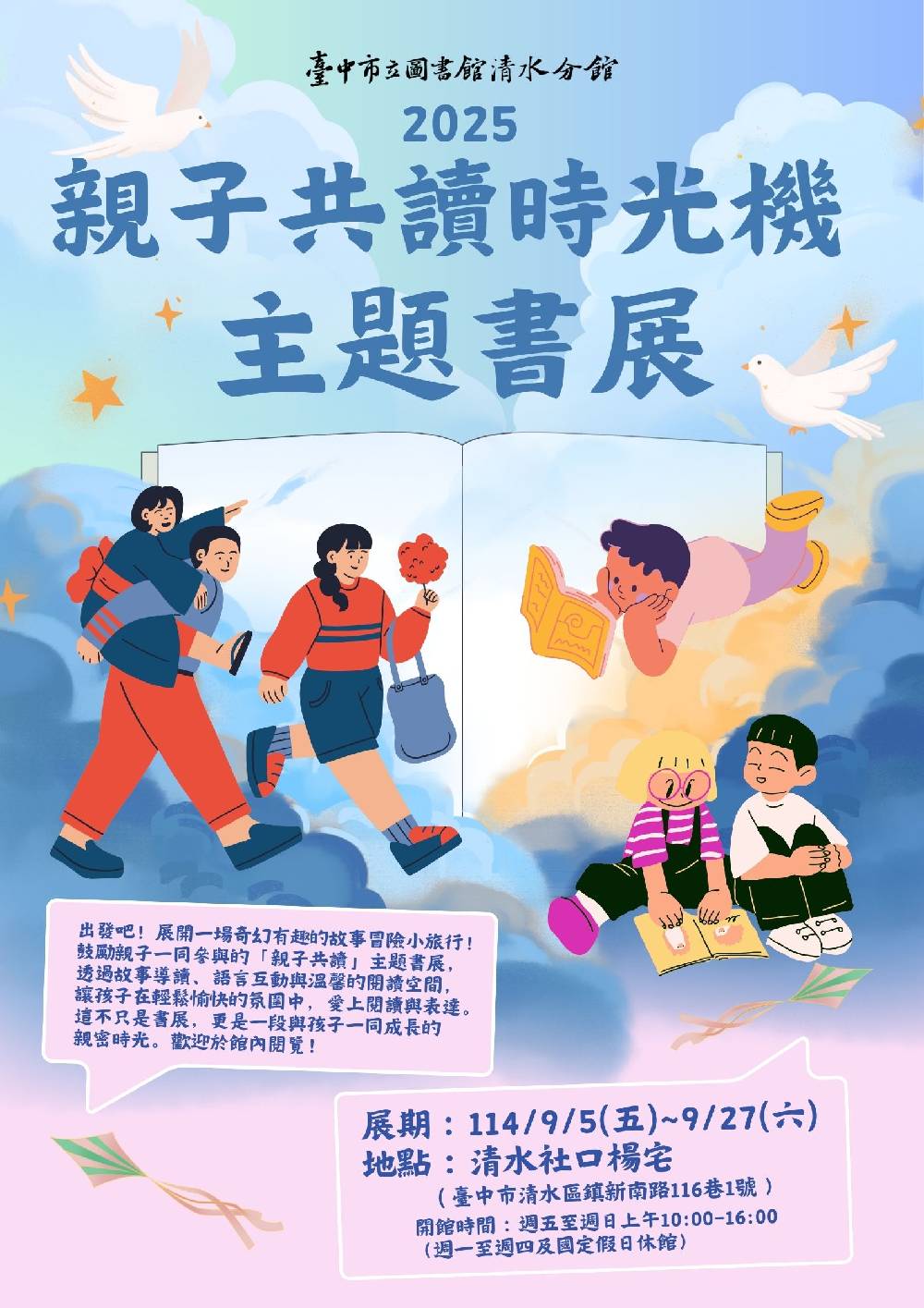 親子共讀時光機 主題書展 出發吧!展開一場奇幻有趣的故事冒險小旅行!鼓勵親子一同參與的「親子共讀」主題書展, 透過故事導讀、語言互動與溫馨的閱讀空間,讓孩子在輕鬆愉快的氛圍中,愛上閱讀與表達。 這不只是書展,更是一段與孩子一同成長的親密時光。歡迎於館內閱覽!