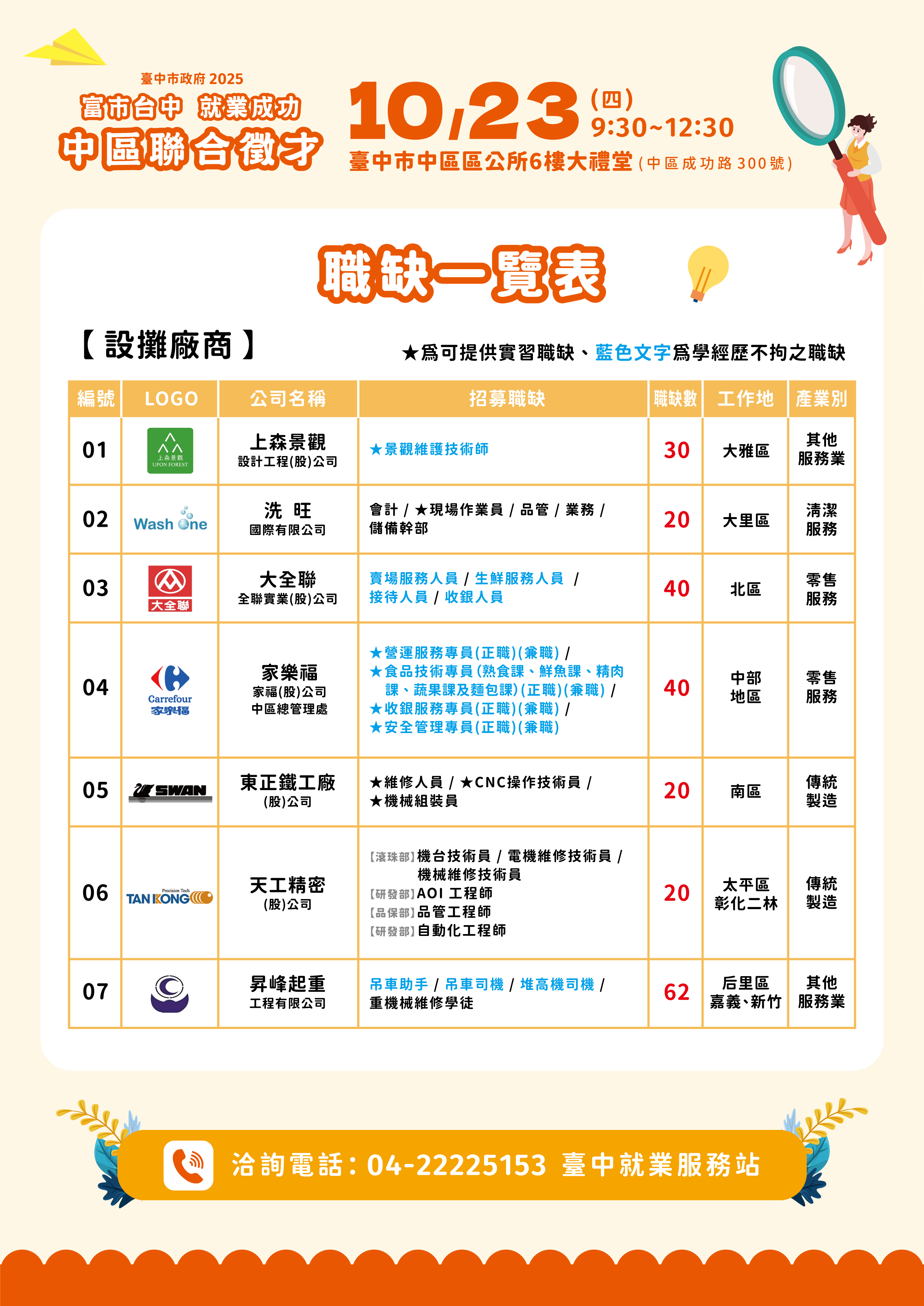 邀請家樂福、大全聯、天工精密、昇峰起重等7家廠商徵才,提供超過200個工作機會,歡迎踴躍參加。