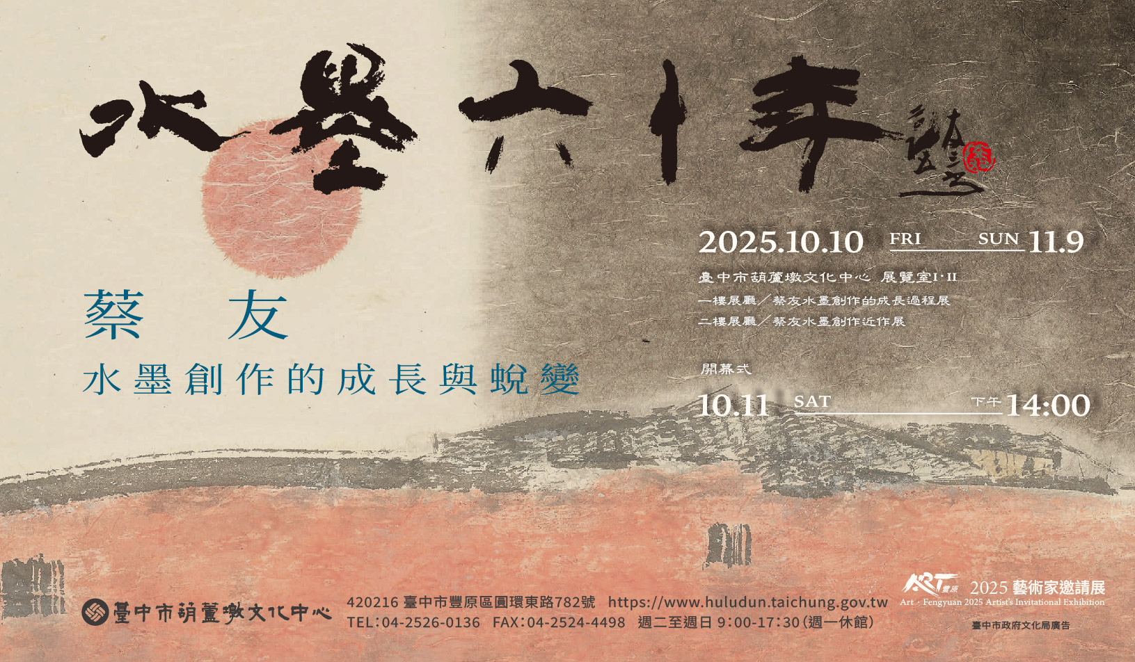 內容 「ART.豐原藝術家邀請展」由臺中市政府文化局自2016年辦理至今已邁入第10年,每年展出資深前輩藝術家作品,透過其深厚的人生歷練與藝術能量,帶給社會大眾更多關於美的體悟。2025年邀請前國立臺灣藝術大學書畫學系主任蔡友老師,以「水墨六十年-蔡友水墨創作的成長與蛻變」為題,完整呈現蓄積多年的創作成果,帶領觀者走進筆墨流轉的藝術世界。