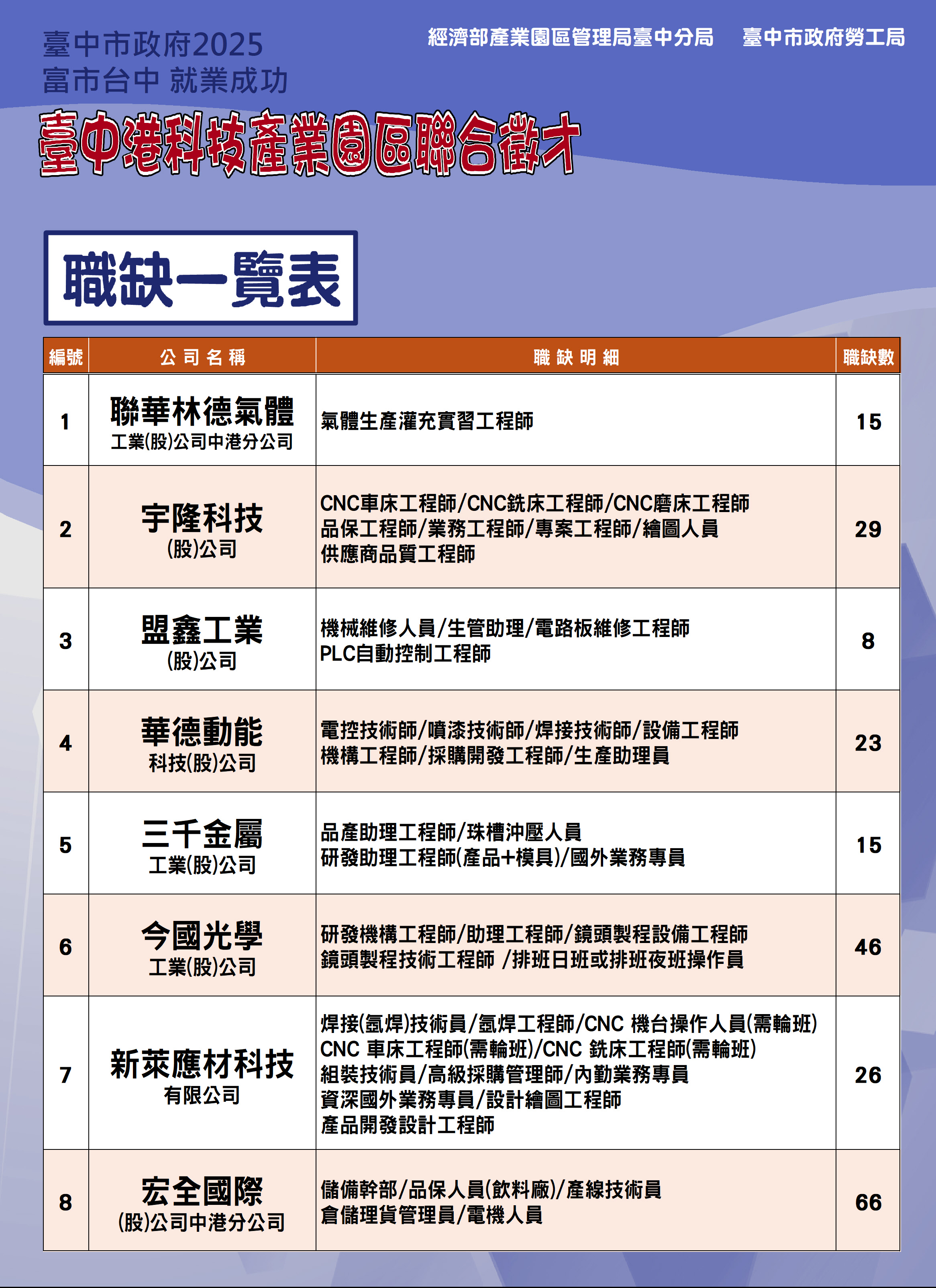 本場邀請聯華氣體、宇隆科技、盟鑫工業、華德動能、三千金屬、今國光學、新萊應材及宏全國際等8家廠商,共計228個工作機會,歡迎市民朋友踴躍前往參加!