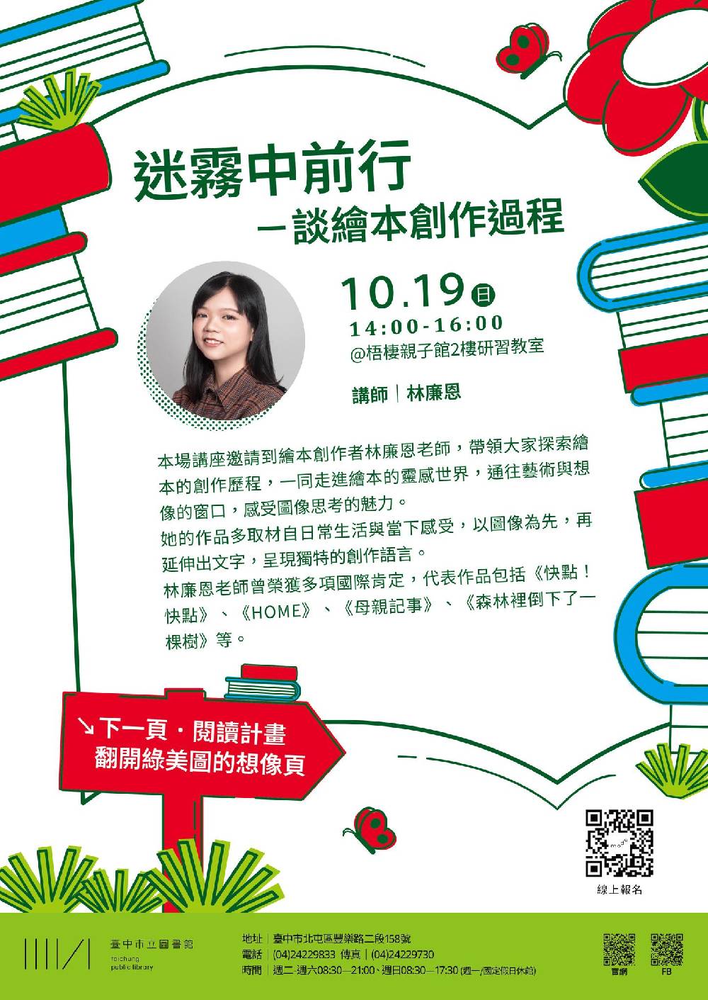 內容:迷霧中前行,是一場關於探索與創造的旅程。 本場講座特別邀請 繪本創作者林廉恩 老師──出生並成長於台灣,擅長複合媒材拼貼、壓克力顏料與水性蠟筆創作,作品靈感多源於日常經驗與當下感受。林老師以「先有畫面,才有文字」的創作方式著稱,風格獨具。 曾獲 美國3X3當代插畫獎、多次 波隆那兒童插畫獎、波隆納拉加茲文學類首獎及 金鼎獎 等國際肯定。著有《快點!快點》、《HOME》、《母親記事》、《森林裡倒下了一棵樹》等作品。 |